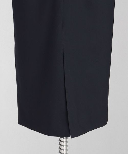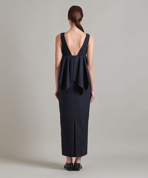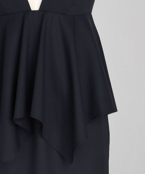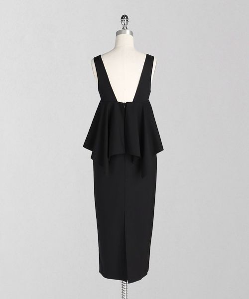 胸元のきれいなカッティングと特徴のあるバックデザイン、すっきりとしたIラインシルエットにペプラムが効いた美しいドレスです。
