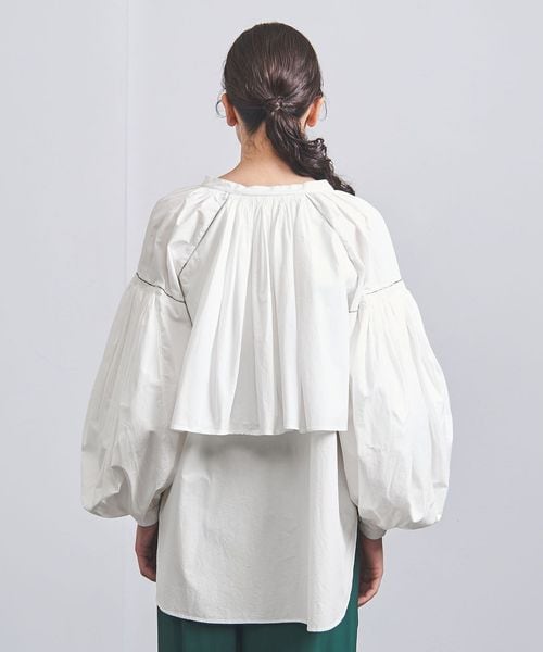 二段使いと繊細なカラーステッチで彩られた、華やかなデザインが印象的なブラウス。