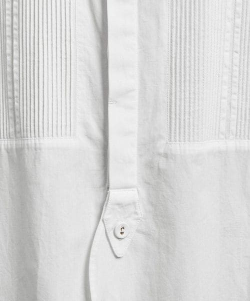 ホワイトカラーの襟の裏側を、薄いベージュで仕立てることで、着用いただく中での生地の黄ばみを目立ちづらくし、さらに長く着ていただけるようにと考えています。