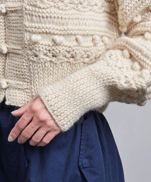 インドの原毛をネパールで紡績し、1点1点手編みしたハンドニットです。