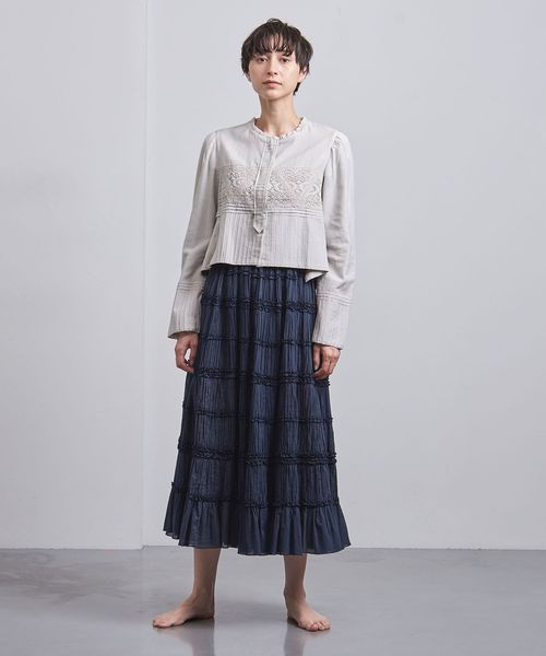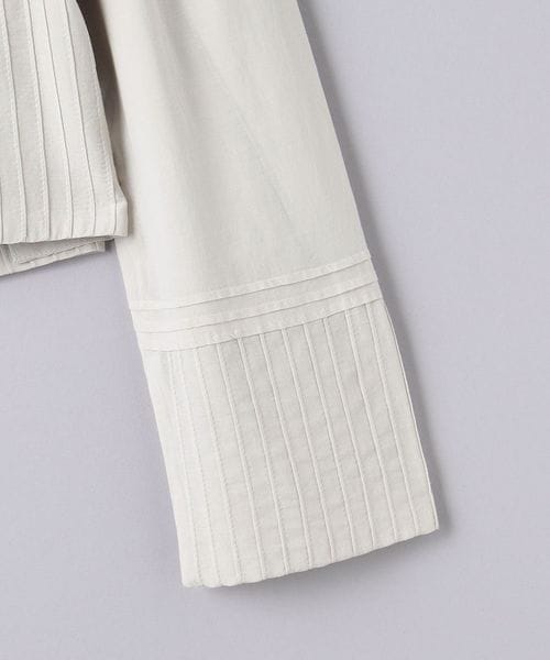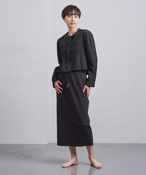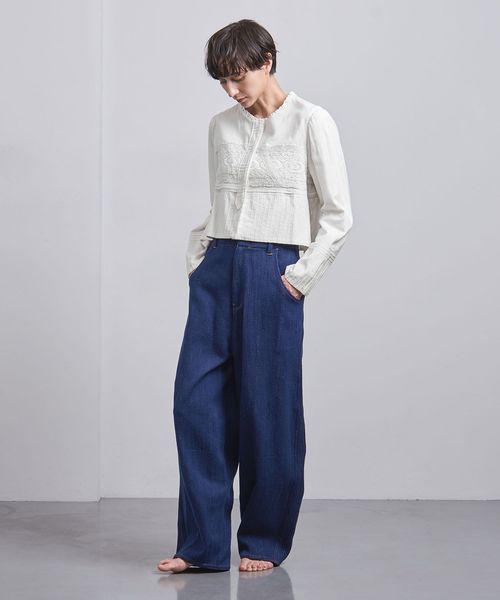 着丈が短めなので、女性的なスカートにも、マニッシュなパンツにも合わせやすく、バランスの取りやすい1枚です。