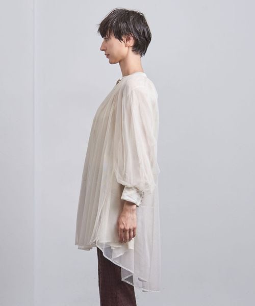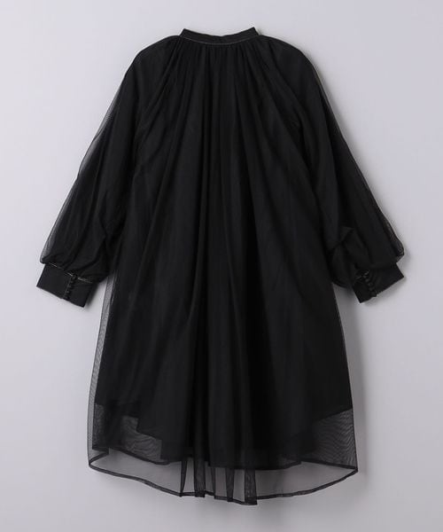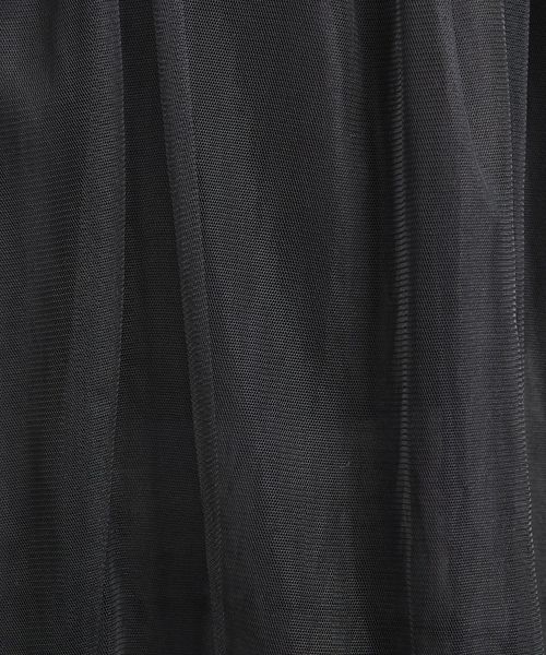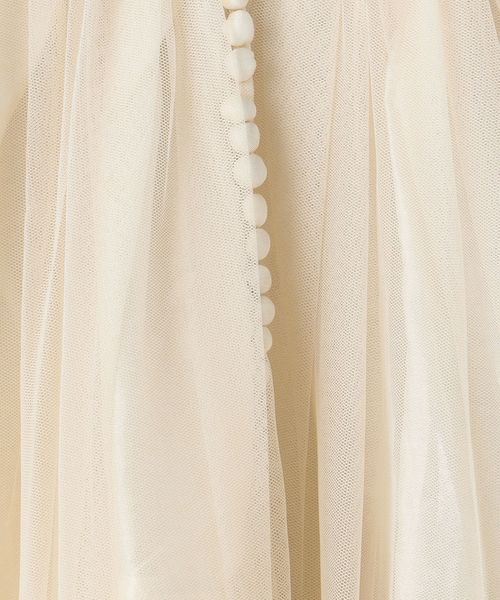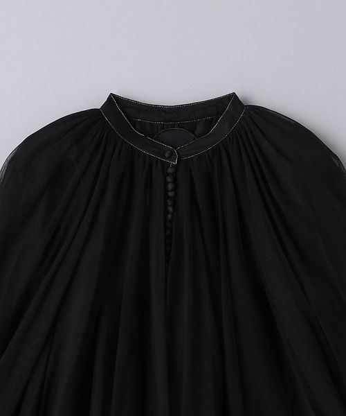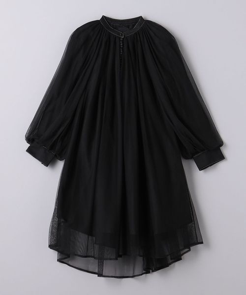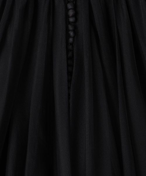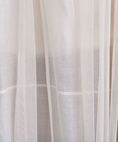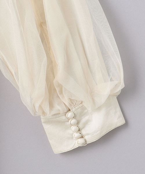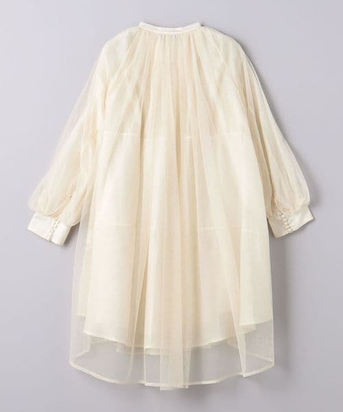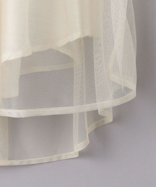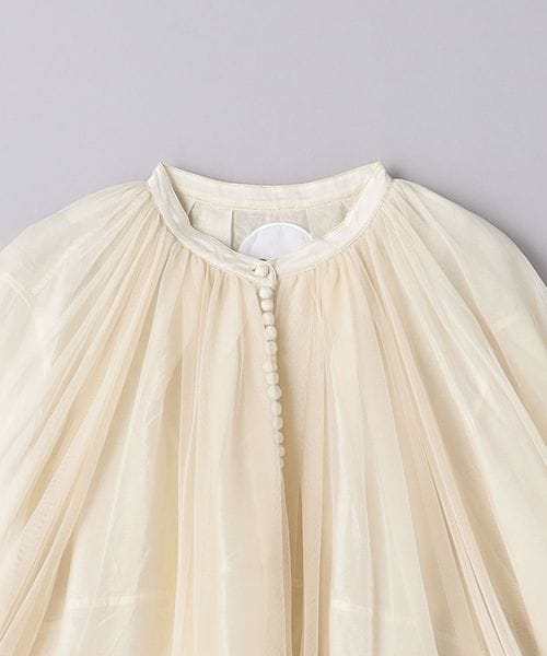 シルク混ならではの上品な光沢感の素材の上に、チュールを重ね、贅沢にギャザーを寄せることでボリュームのあるシルエットに仕上げています。