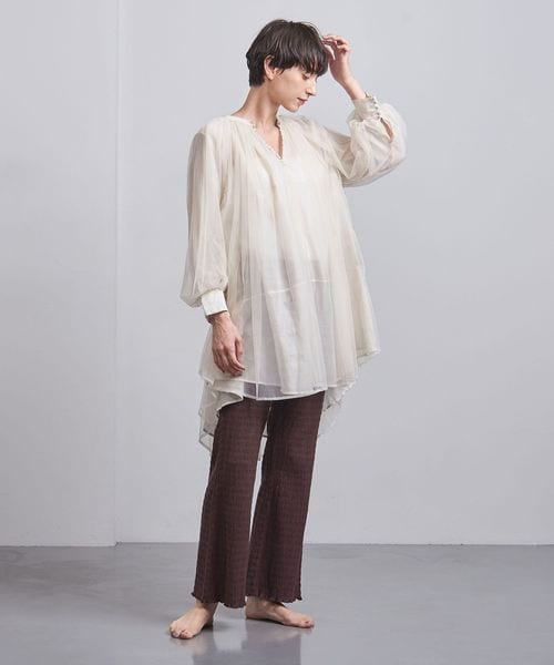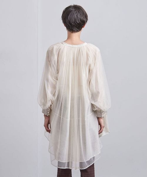前後差のある着丈やふんわりとした袖がフェミニンさを押し上げます。