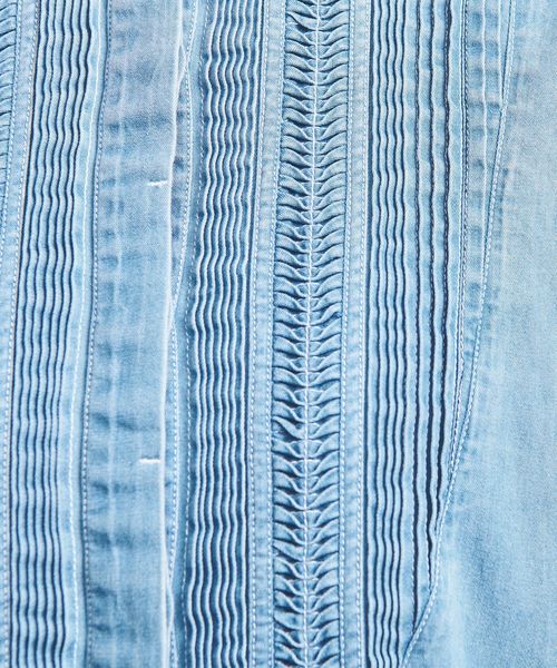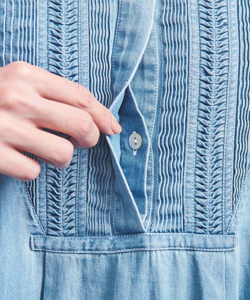 胸回りの生地を切り替えたメンズのフォーマルなブザムシャツを、女性の日常に組み入れたシリーズ「Trinity」
