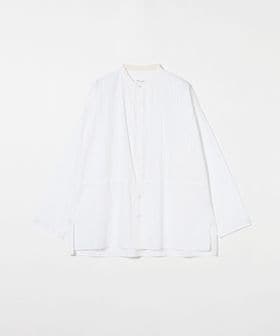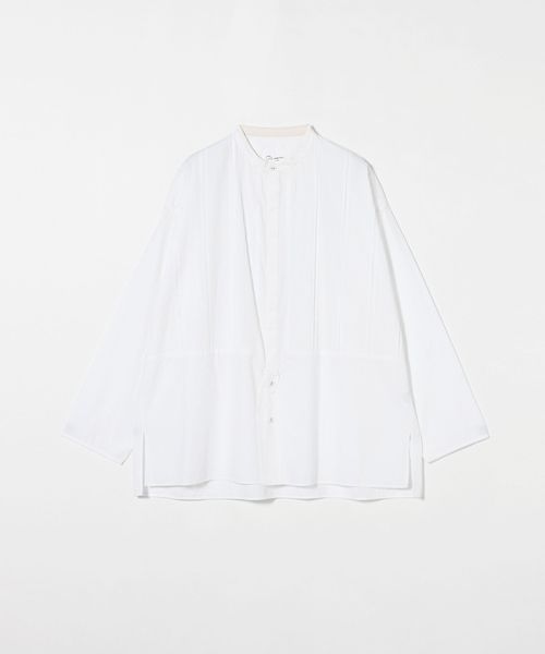 切り替えた胸元のディテールは、本来のプザムシャツの美意識を踏襲し、丁寧な手仕事のピンタックで表現しています。