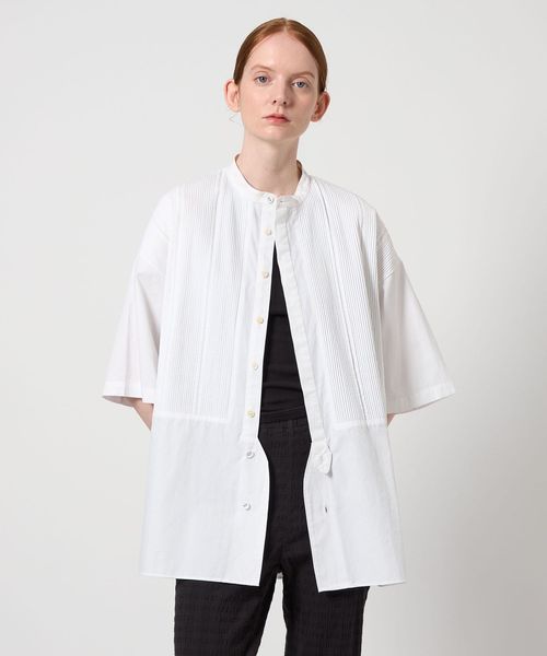 切り替えた胸元のディテールは、本来のブザムシャツの美意識を踏襲し、丁寧な手仕事のピンタックで表現しています。