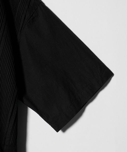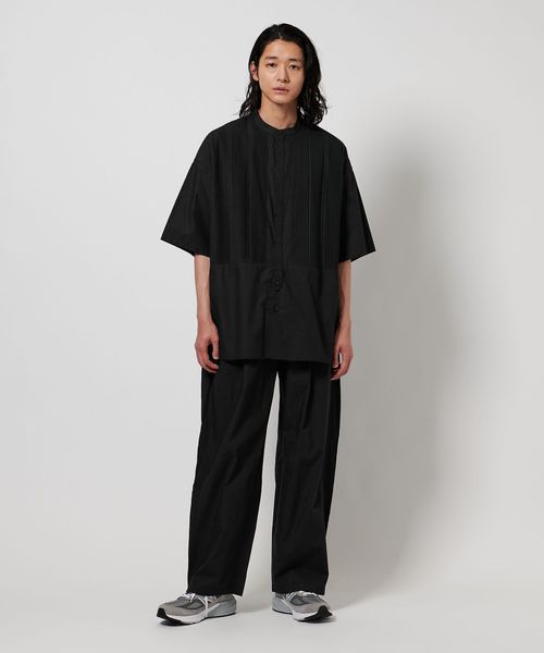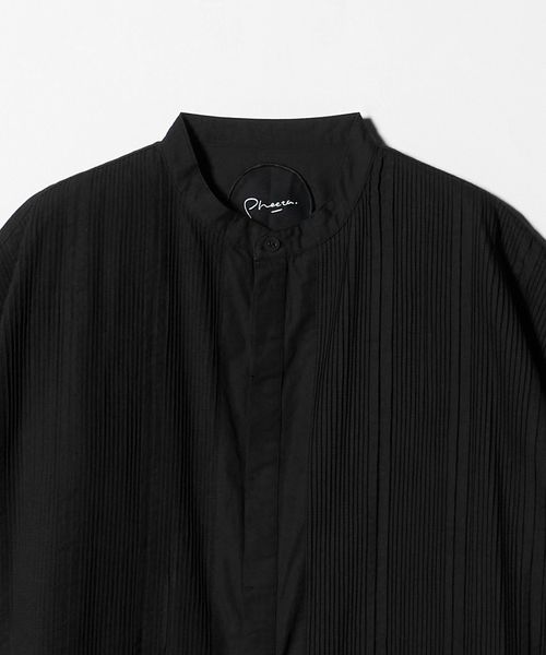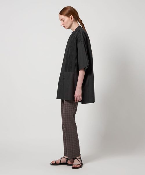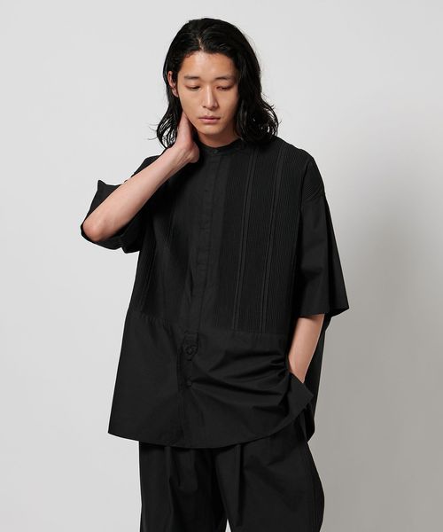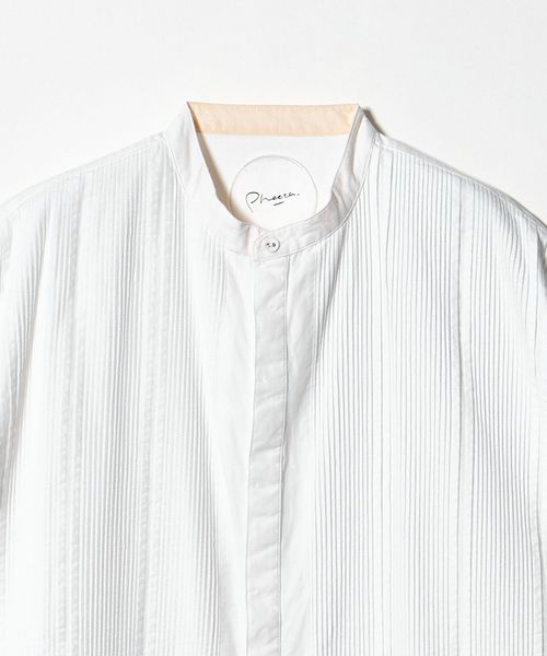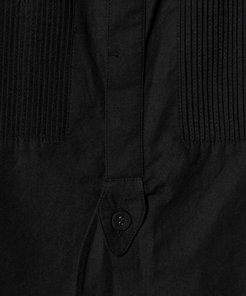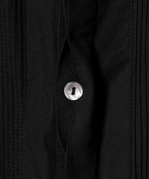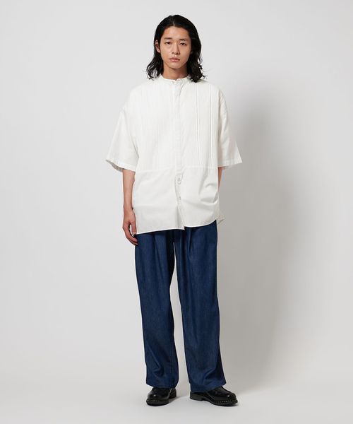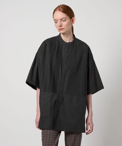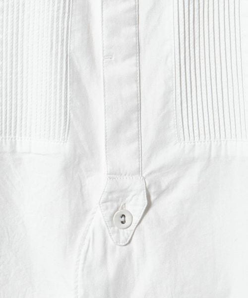 切り替えた胸元のディテールは、本来のブザムシャツの美意識を踏襲し、丁寧な手仕事のピンタックで表現しています。