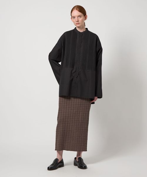 また、綿糸にリネンを少し加え、生地表面に陰影をつけて織り上げることで、同色のシャドーチェックが浮かび上がるように仕立てました。