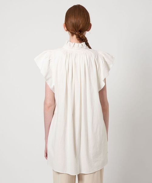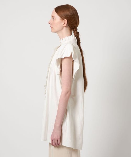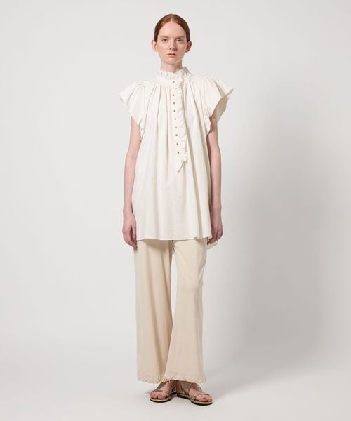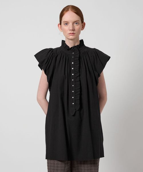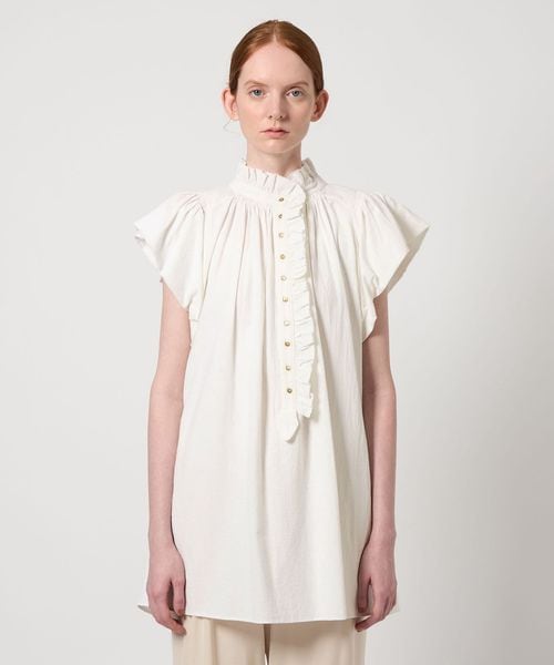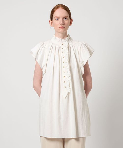 手仕事のピンタックやギャザーを贅沢にあしらったチュニック丈のショートスリーブブラウス。