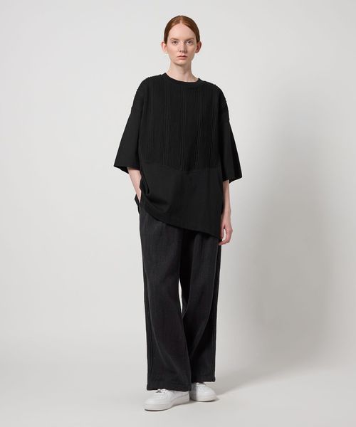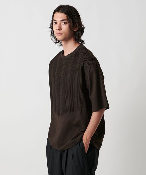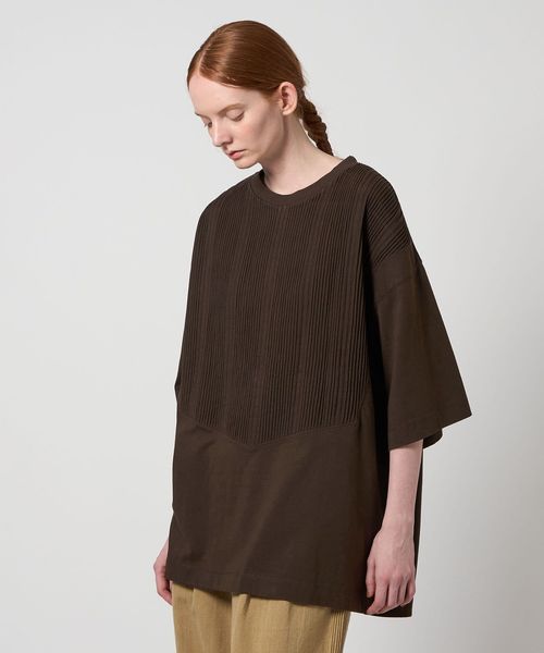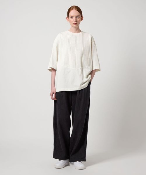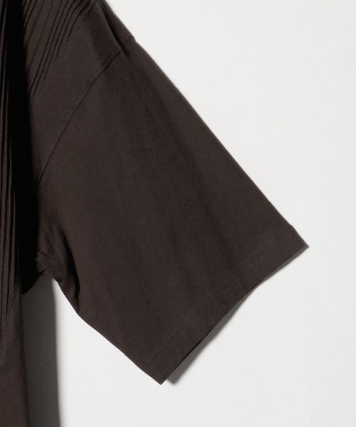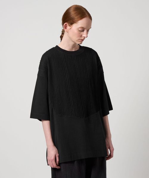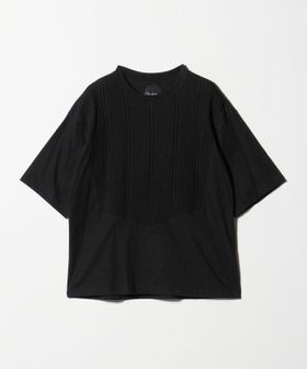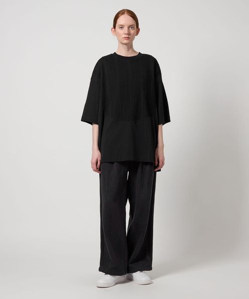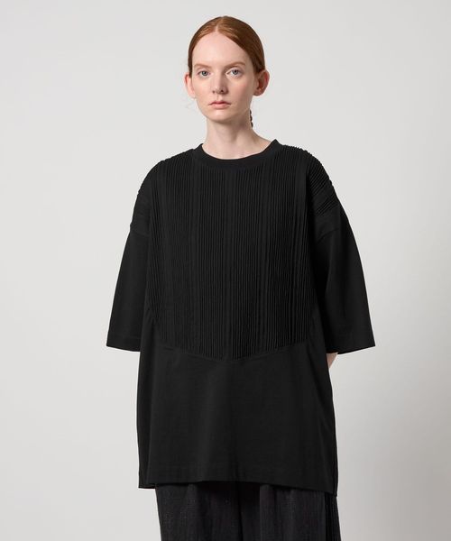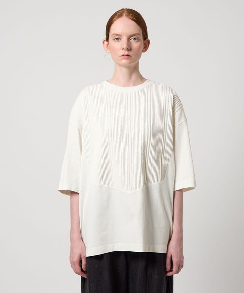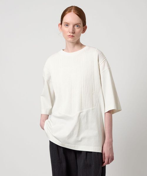 前身頃に縦にピンタックを配した大胆ながら上品に仕上げたハーフスリーブ。