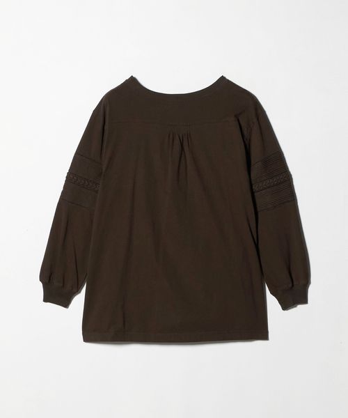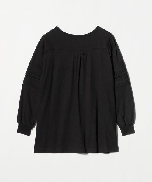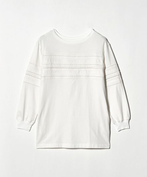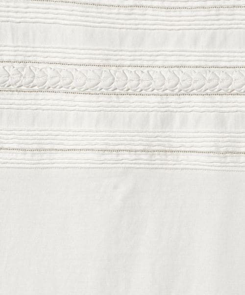 胸元と袖周りにピンタックと2つの異なるレースを施し、カジュアルな素材でリラックスした雰囲気がありながら華やさのあるアイテムです。