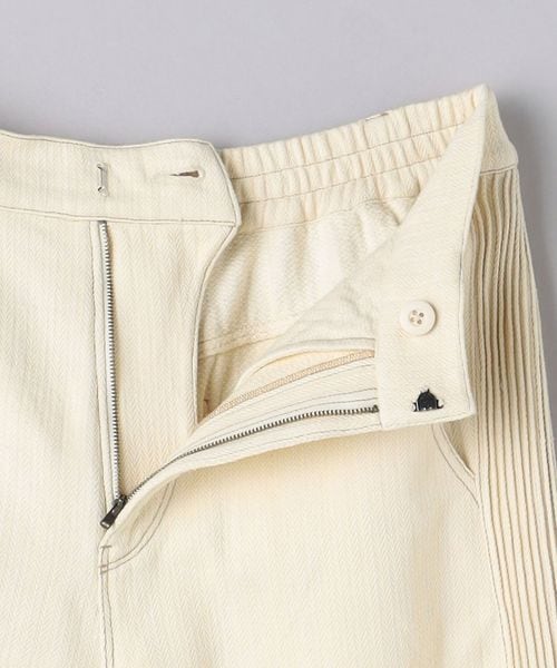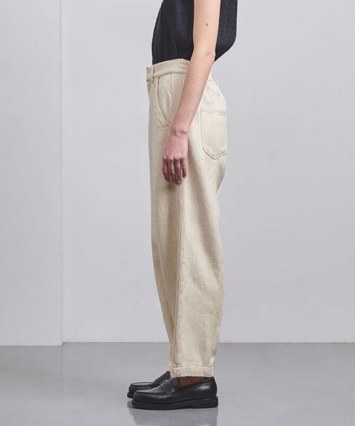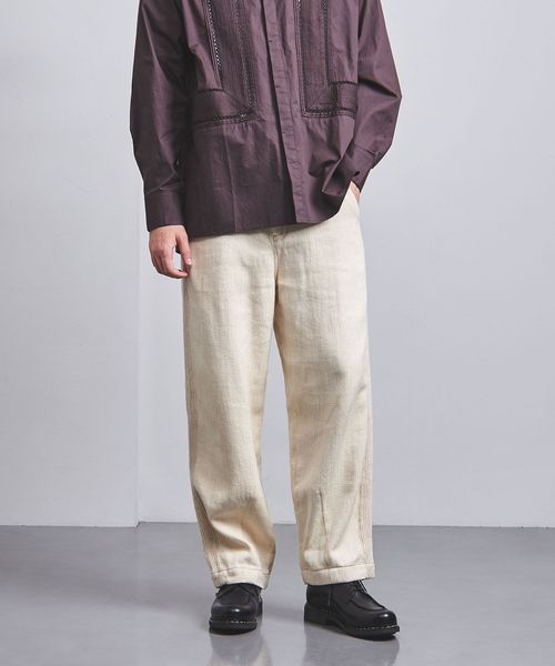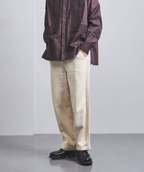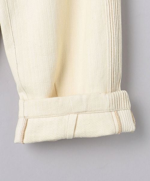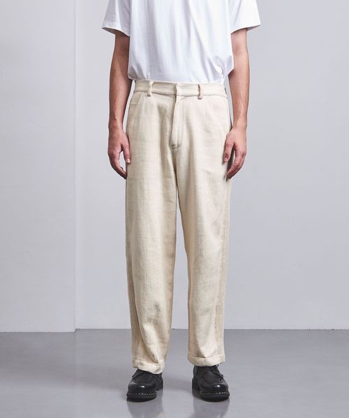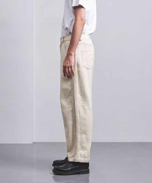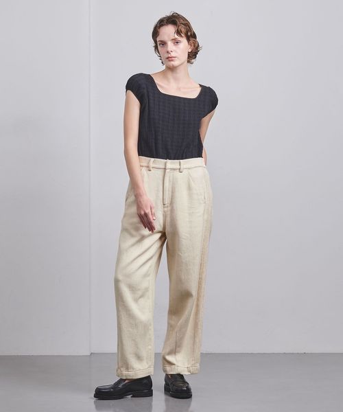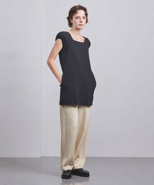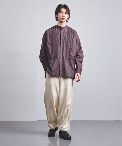 手仕事のピンタックもふんだんにあしらい、甘織の手織り生地の風合いが活きる、ゆったりとした太めのシルエットが特徴。