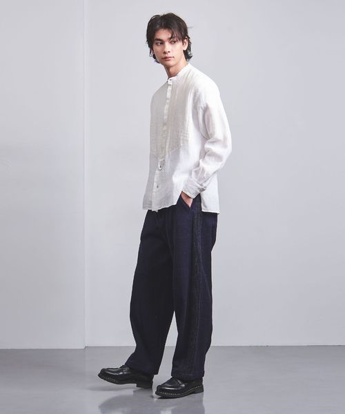 手仕事のピンタックもふんだんにあしらい、甘織の手織り生地の風合いが活きる、ゆったりとした太めのシルエットが特徴。
