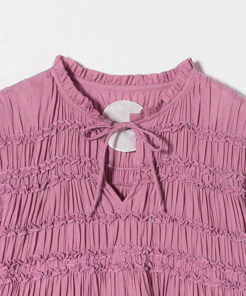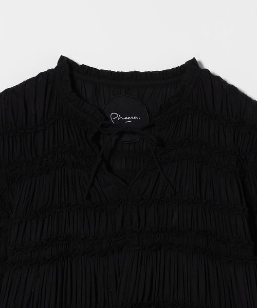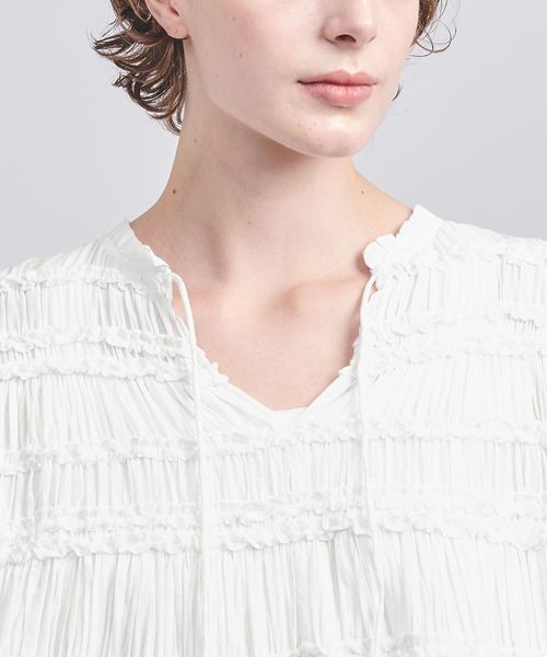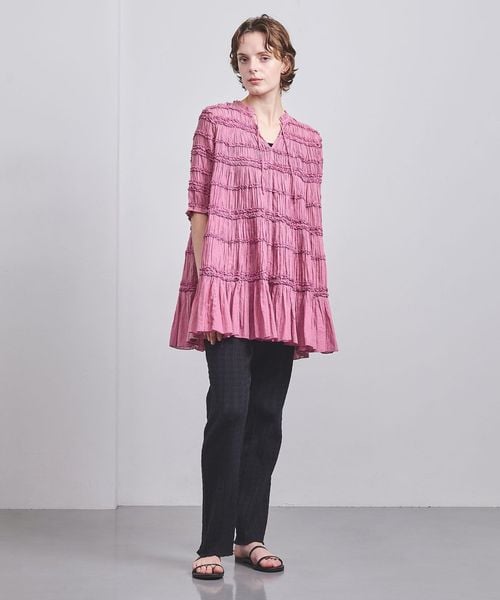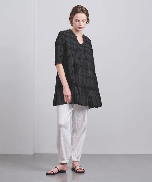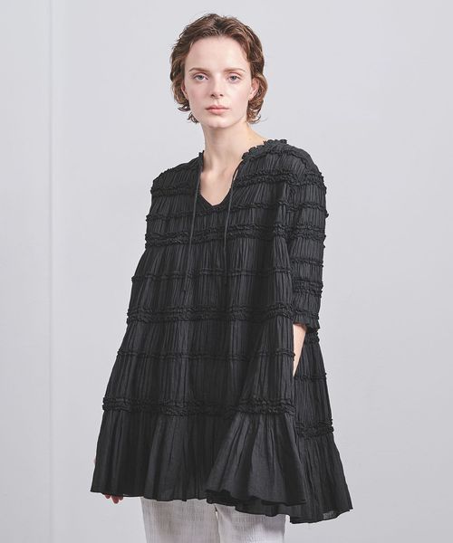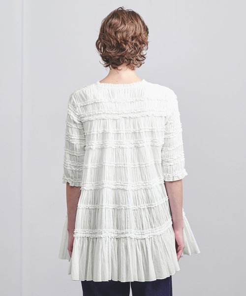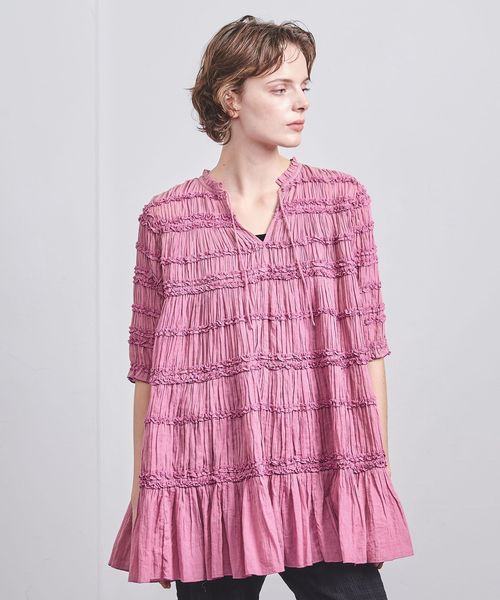 ギャザーのボリュームが華やかなチュニック丈のデザインブラウス。