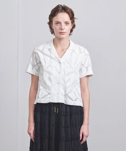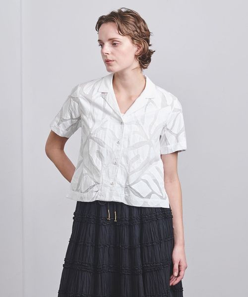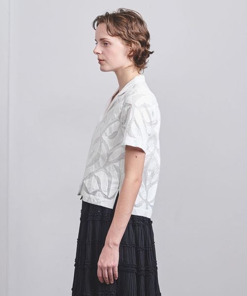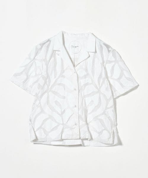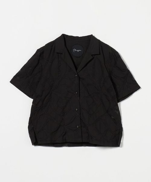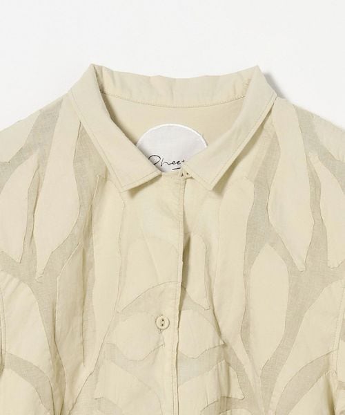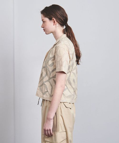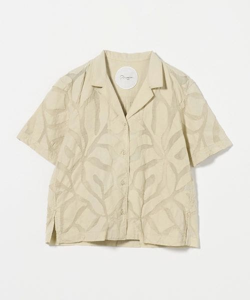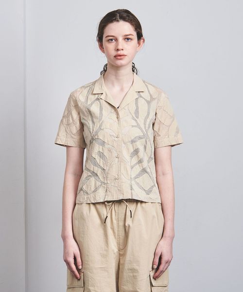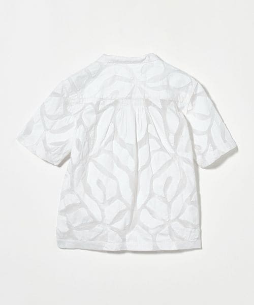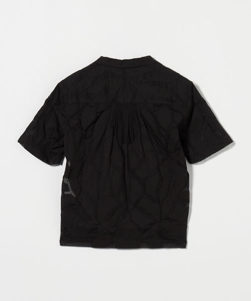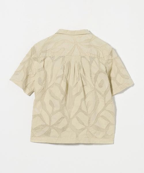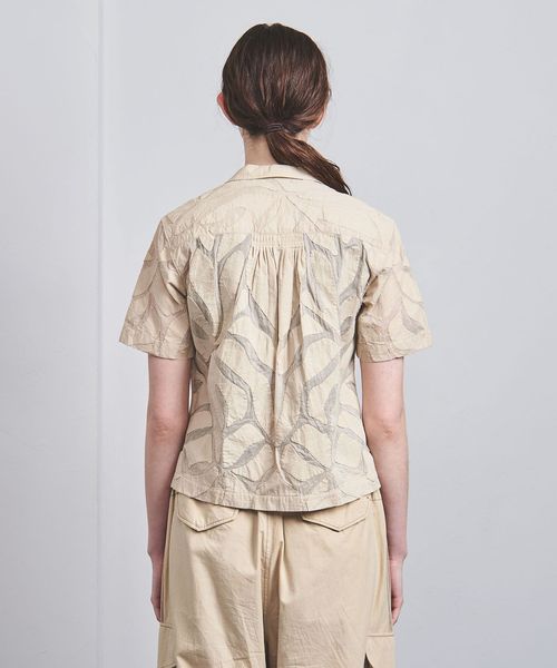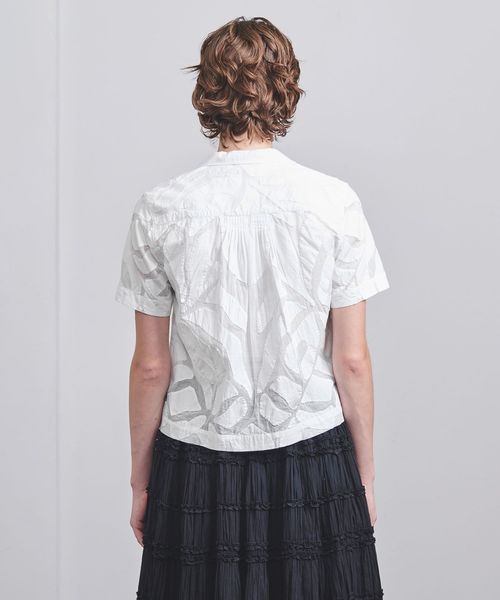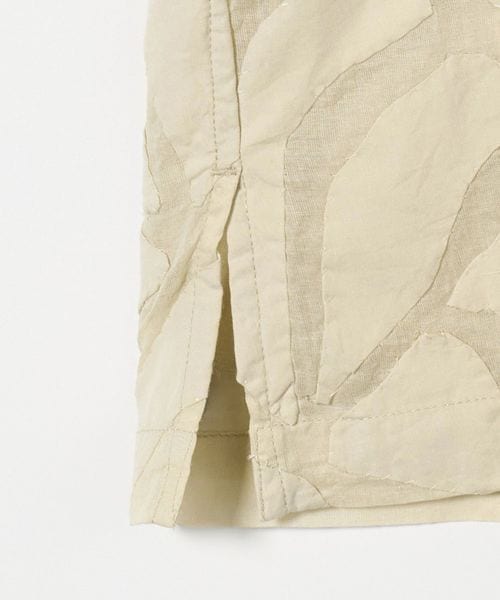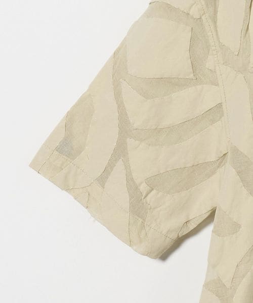 地図のようにも草花のようにも見える図案を書き起こし、一点ずつ表生地をカットしながら手縫いでアップリケを施したショートスリーブシャツ。