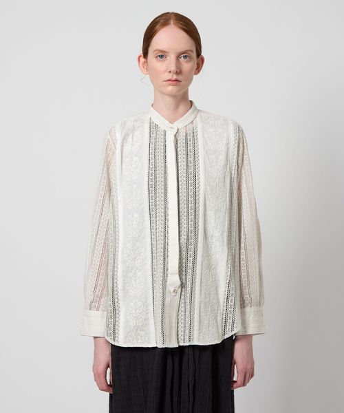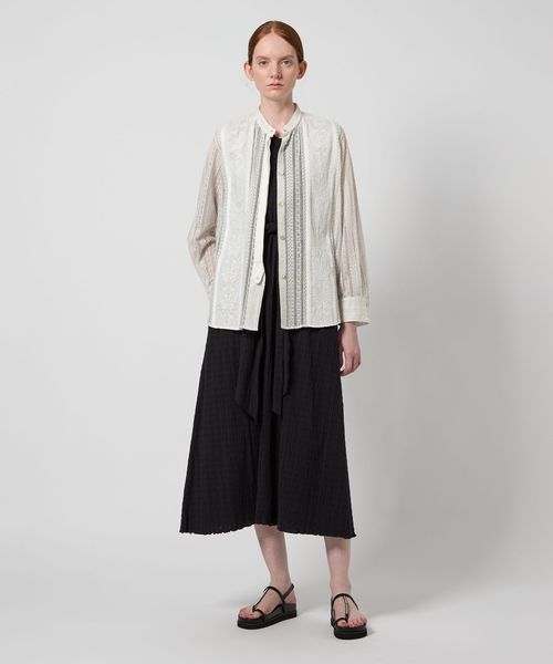 数種類のレースやピンタックを用いて、ゆっくりと時間をかけることで生み出された一着。