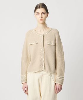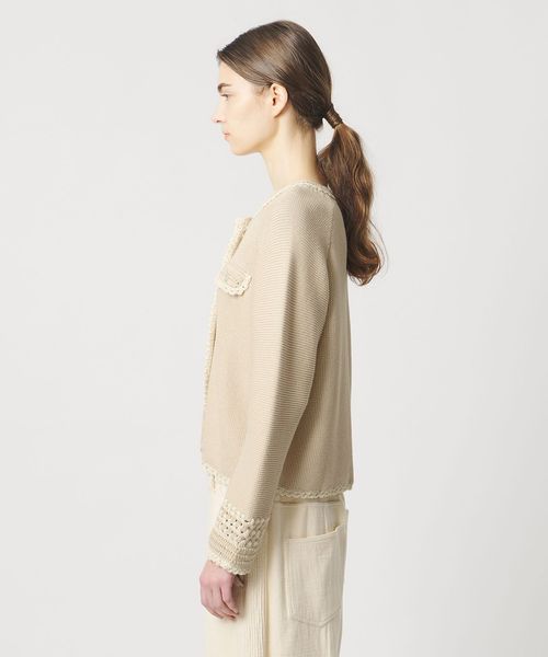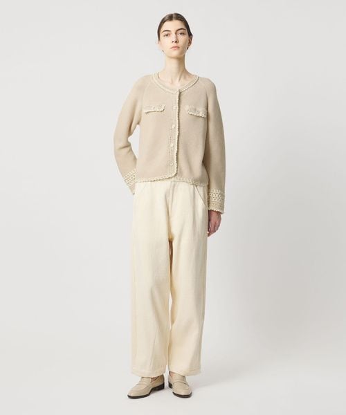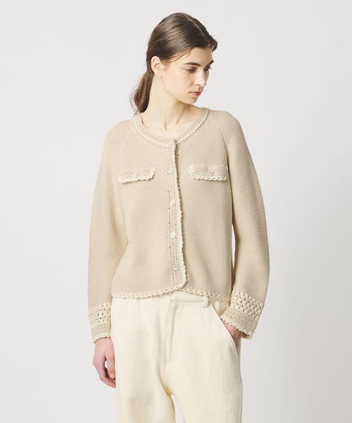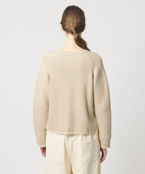 袖口や裾、首回りにハンドクロシェをあしらい、温もりのある表情に仕上げました。