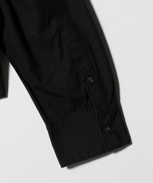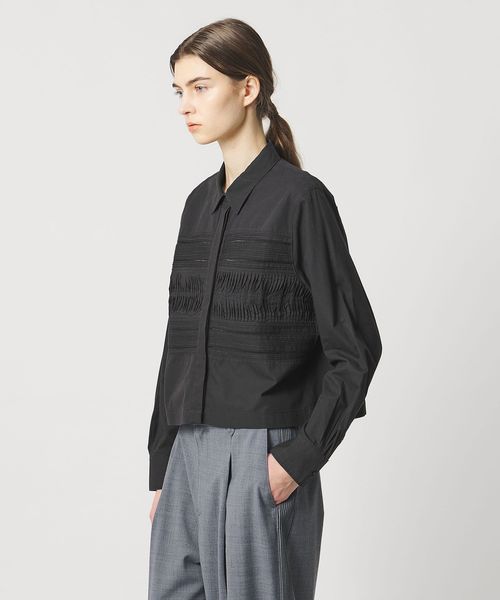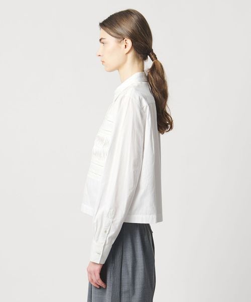襟付きの端正なデザインに加え、胸もとの切り替え部分にはブザムシャツ由来のフォーマルな要素を取り入れています。