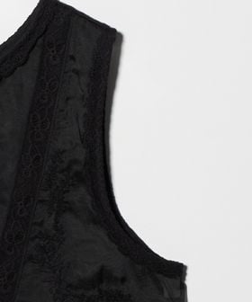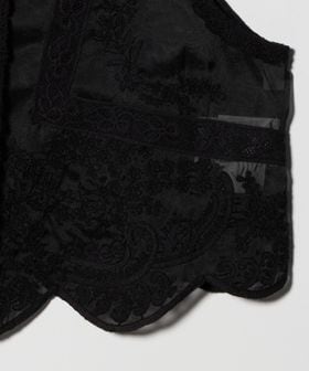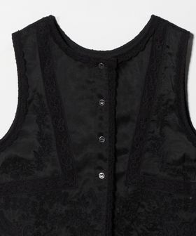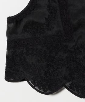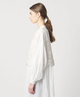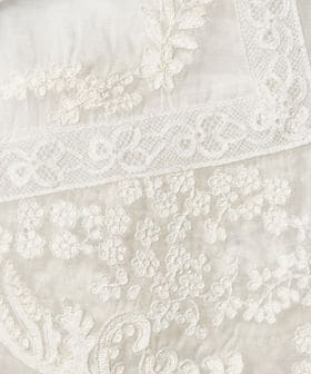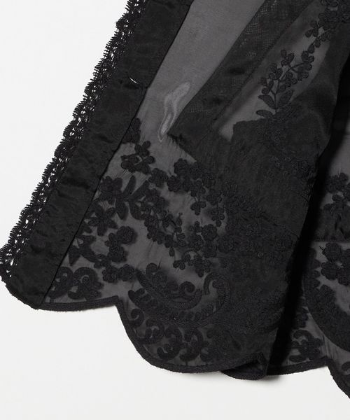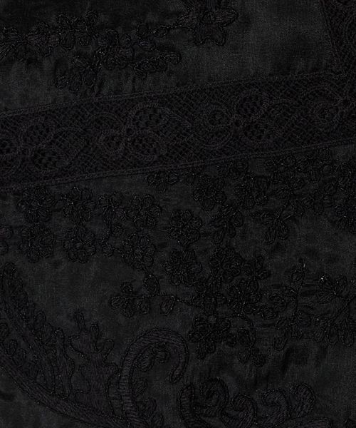張りと透け感を併せもつポリエステル生地に、立体的で表情豊かなコード刺繍を施し、美しいレースへと仕立てました。