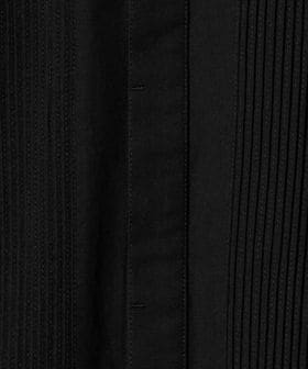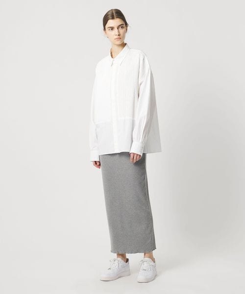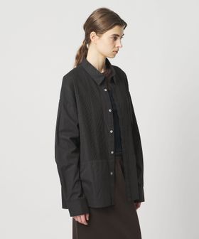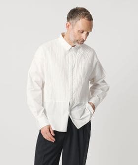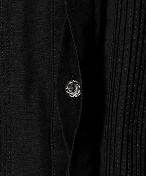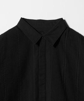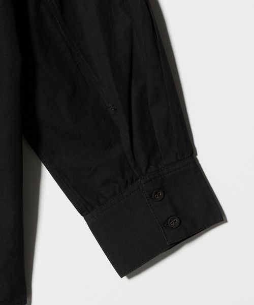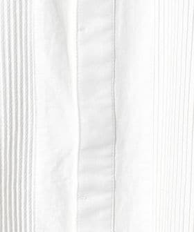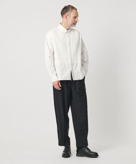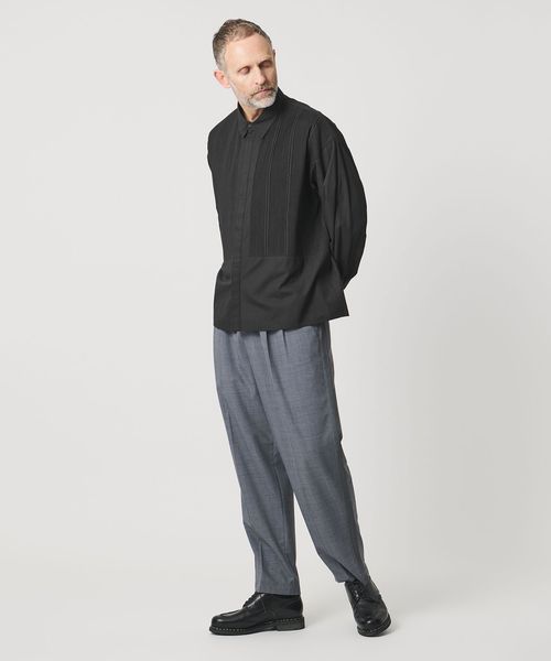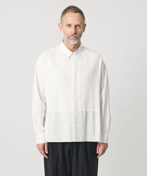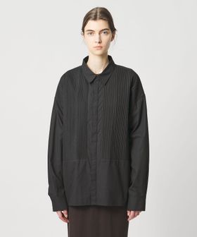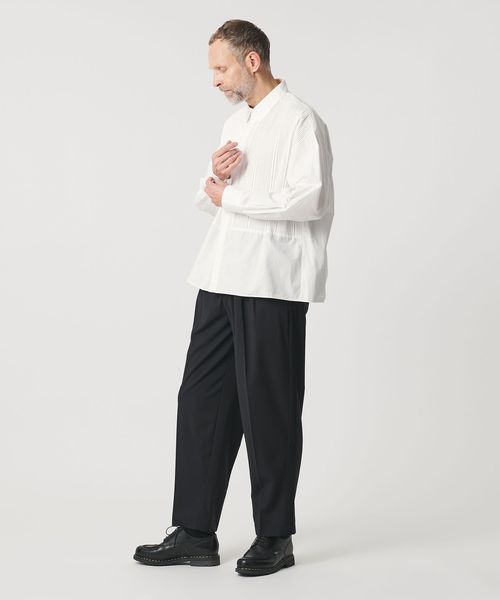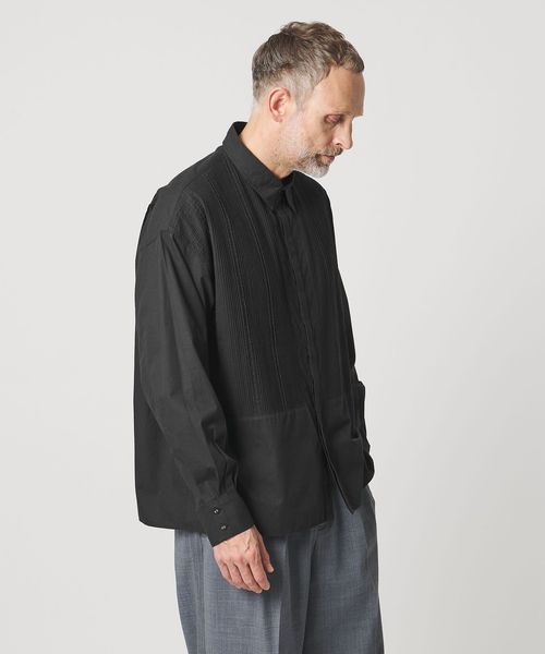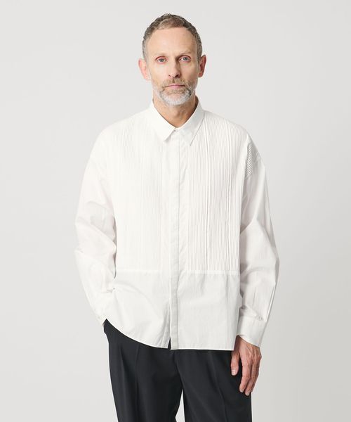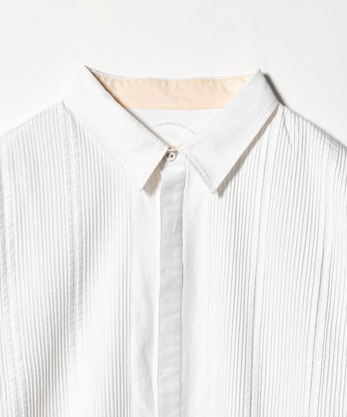 胸元の切り替え部分にはブザムシャツの美意識を受け継いだ、丁寧な手仕事のピンタックを施しています。