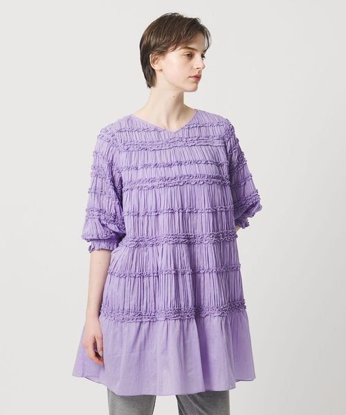 ギャザーのボリュームが華やかなAラインのチュニック丈のブラウス。