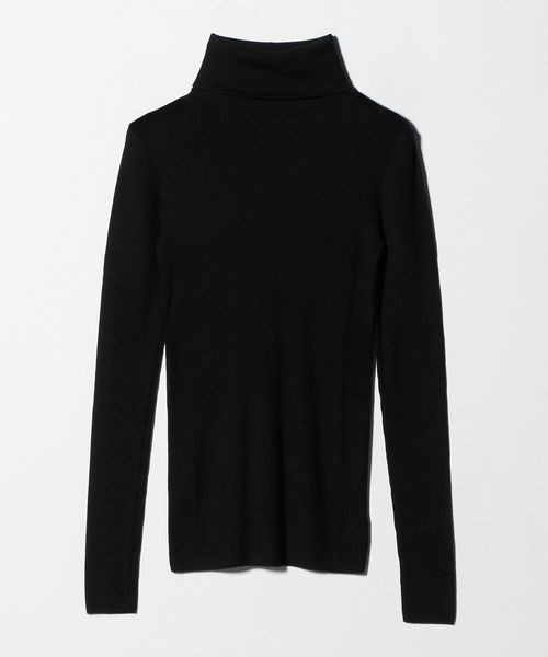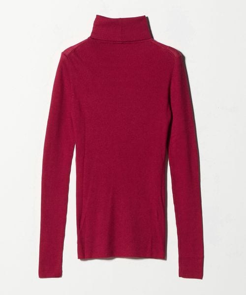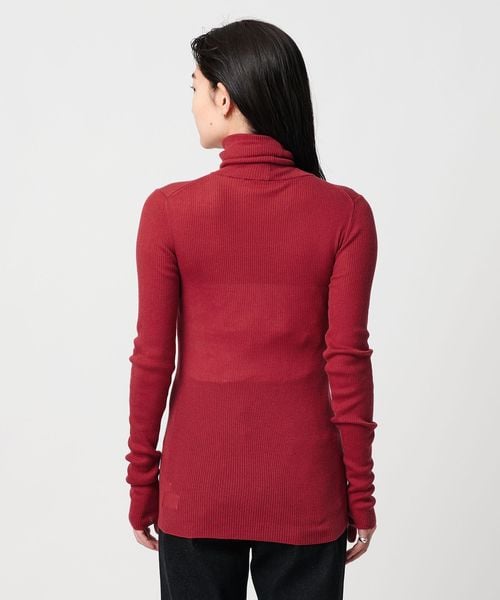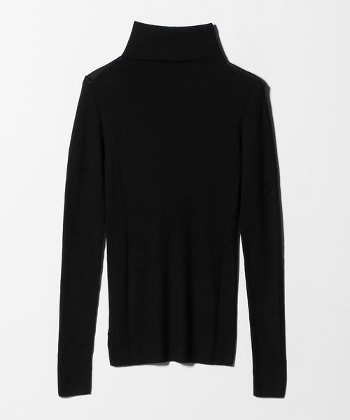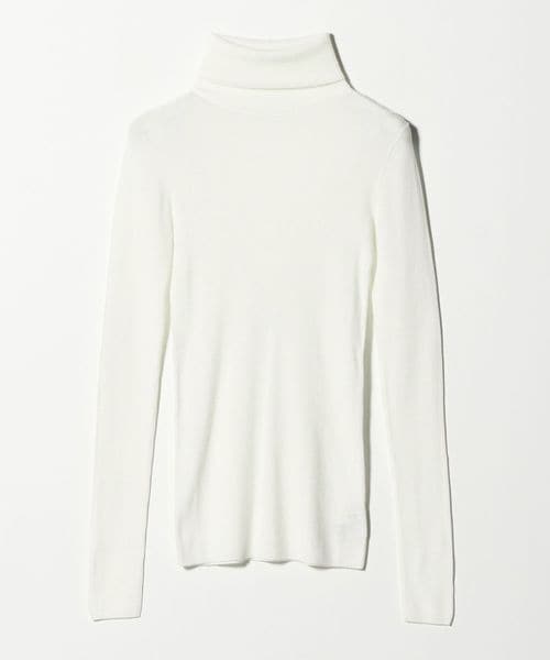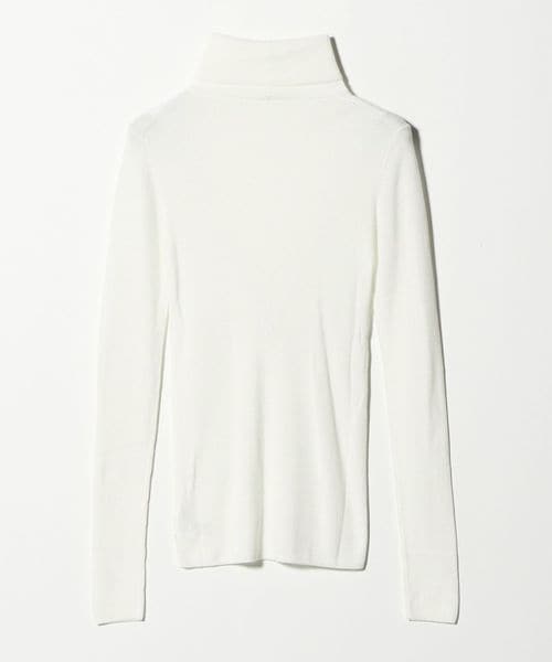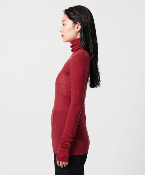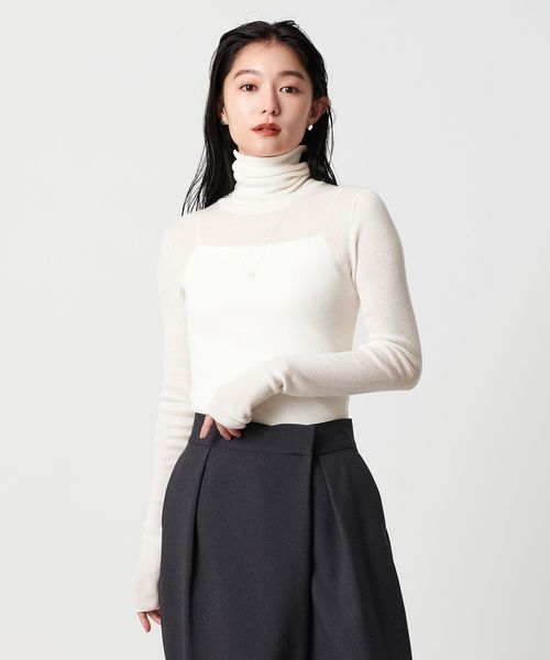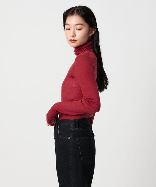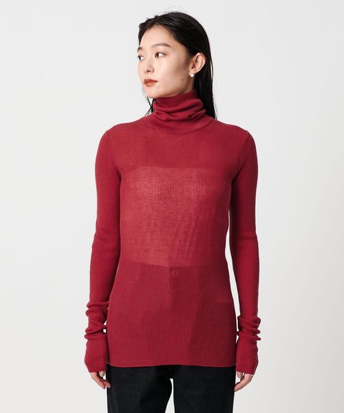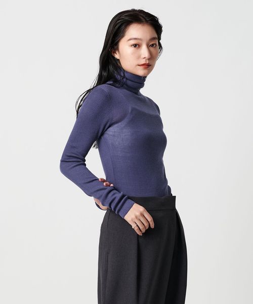 ほど良い透け感が、スタイリングに軽やかさを添えるリブタートルネックニット。