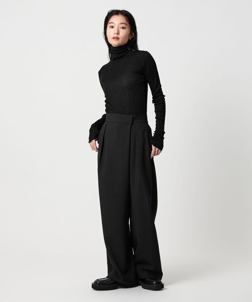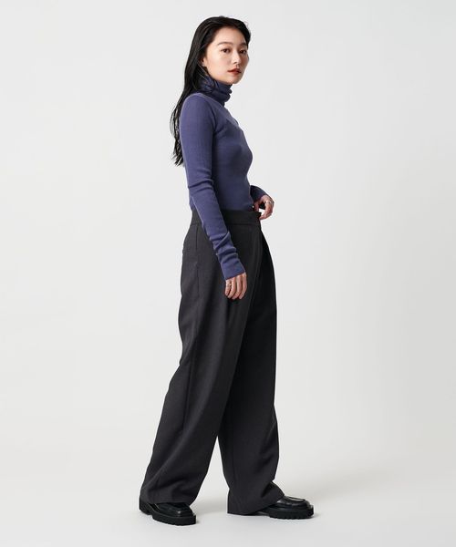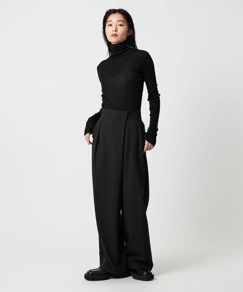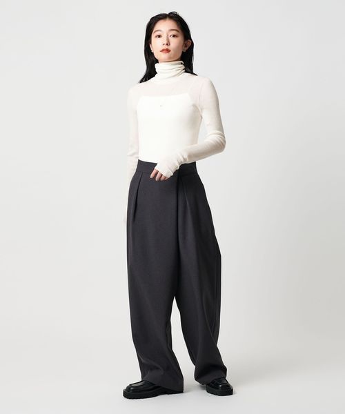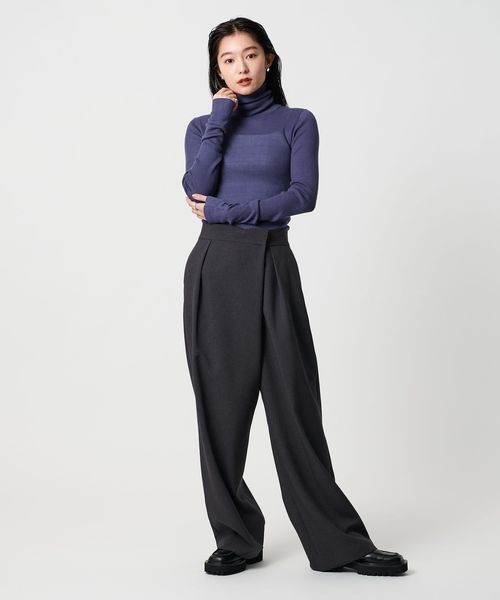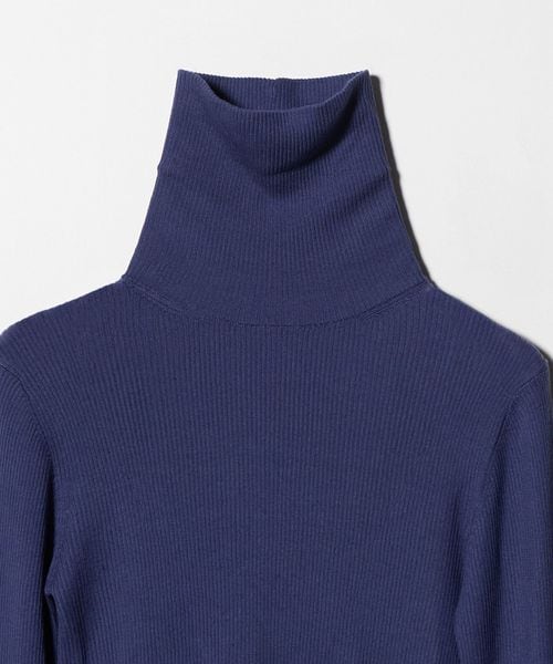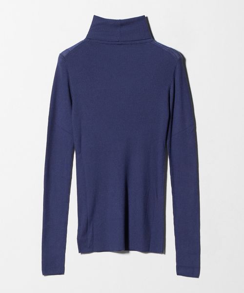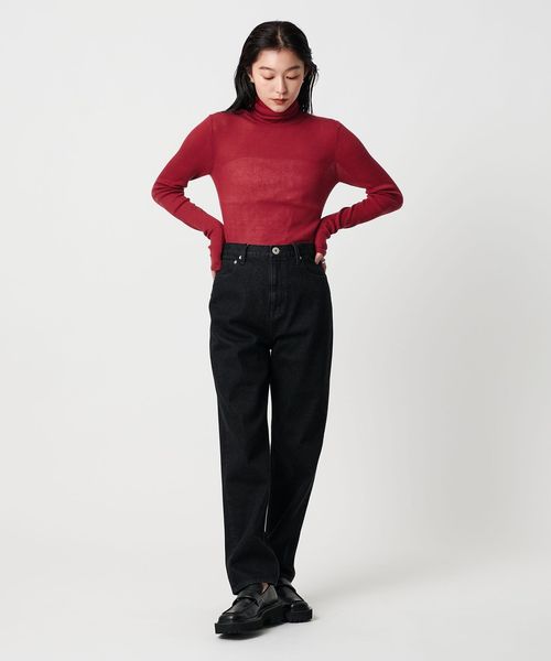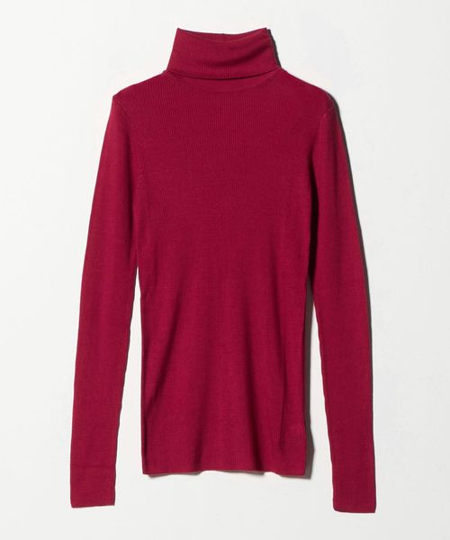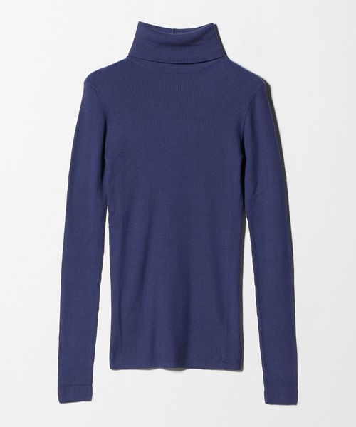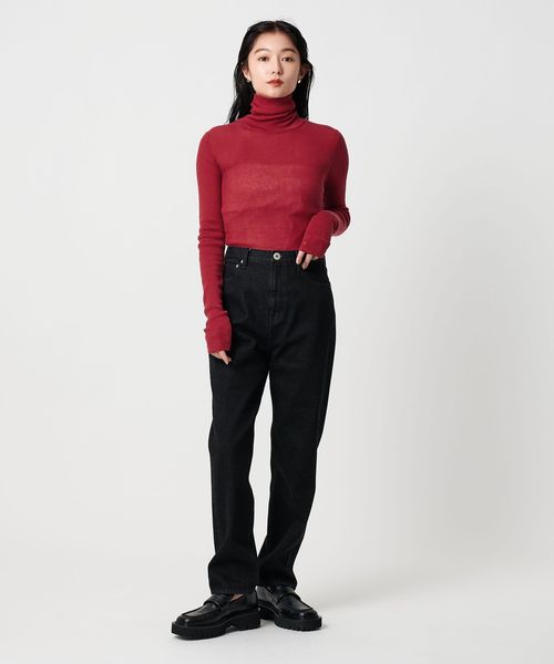 ほど良い透け感が、スタイリングに軽やかさを添えるリブタートルネックニット。