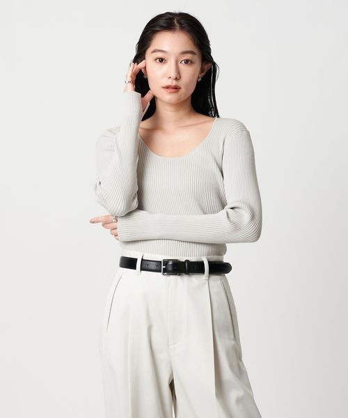 首元の開きが美しく、顔まわりをすっきりと見せてくれるリブニット。