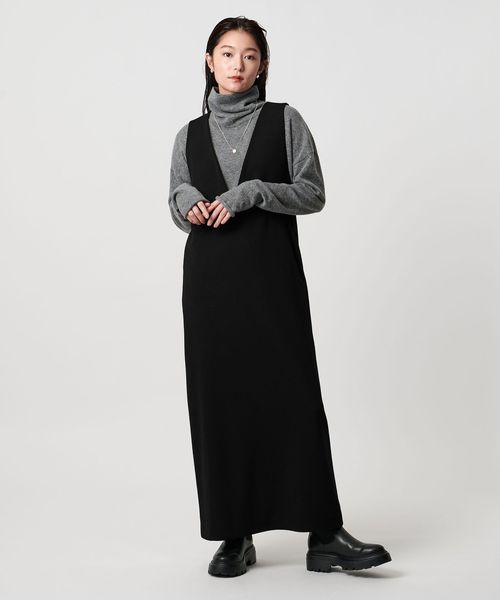 ジャージ素材の柔らかさと、すっきりとしたIラインが魅力のジャンパースカート。