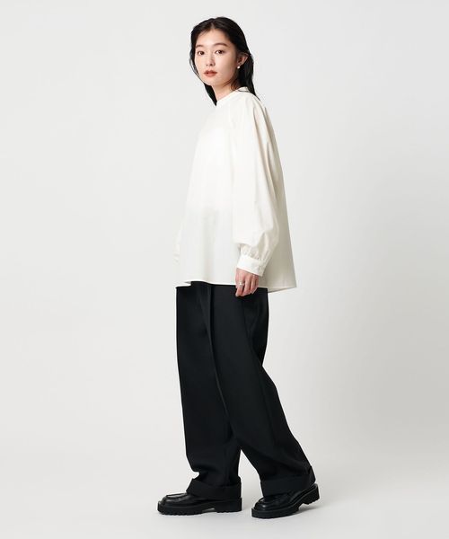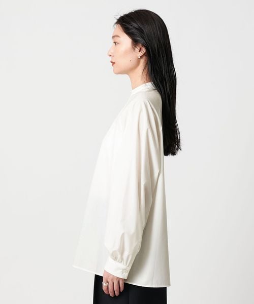 程よいスタンドカラーが、顔まわりに凛とした印象を添えるブラウス。