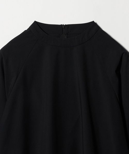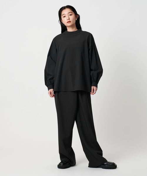 ラグランスリーブで肩のラインを美しく見せ、袖口のギャザーが立体感を演出します。
