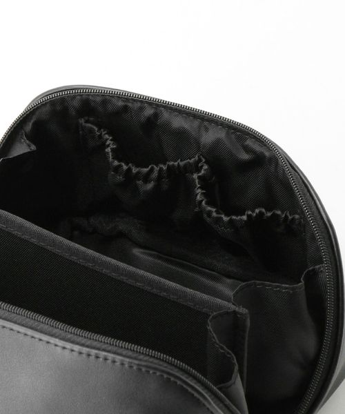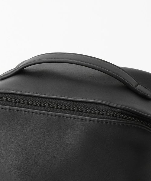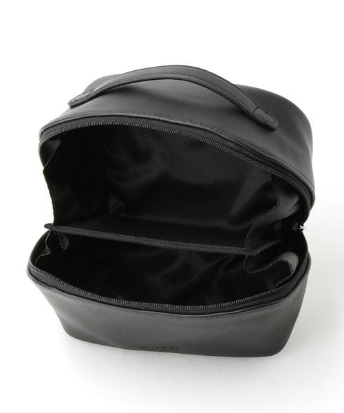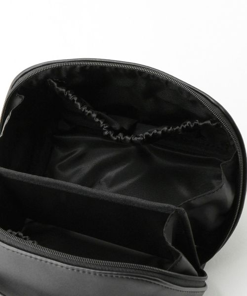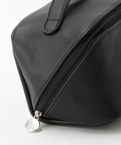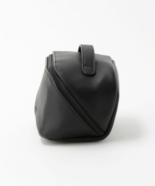 オールブラックでシックなデザインにブランドロゴを入れた丸いシルバーカラーの引手がアクセント。 ボックス型のポーチはファスナーを全開にすると大きく開き自立します。