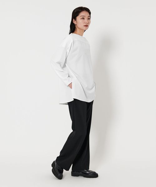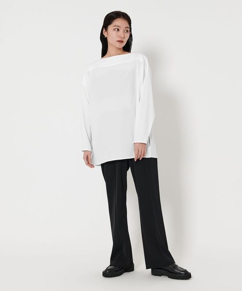 ドロップショルダーに、身体のラインを拾いにくいゆとりのあるシルエットが特徴。