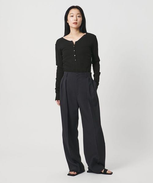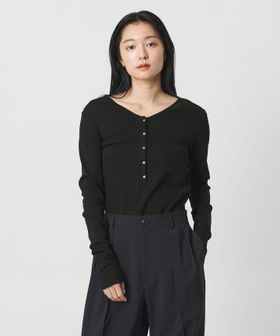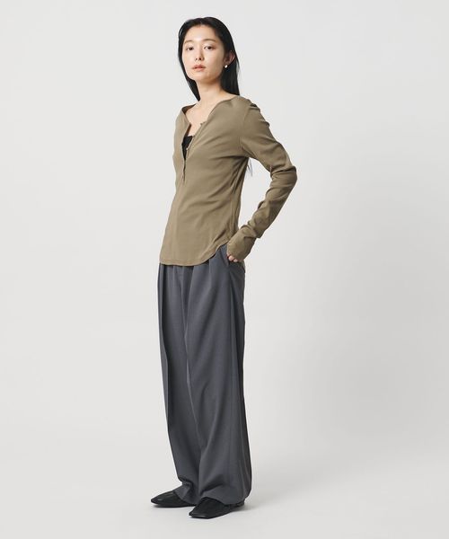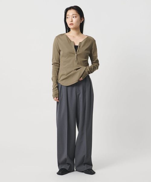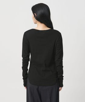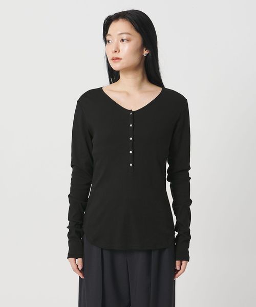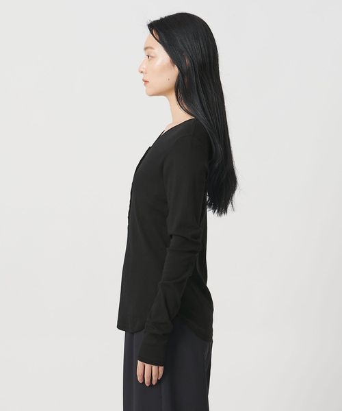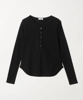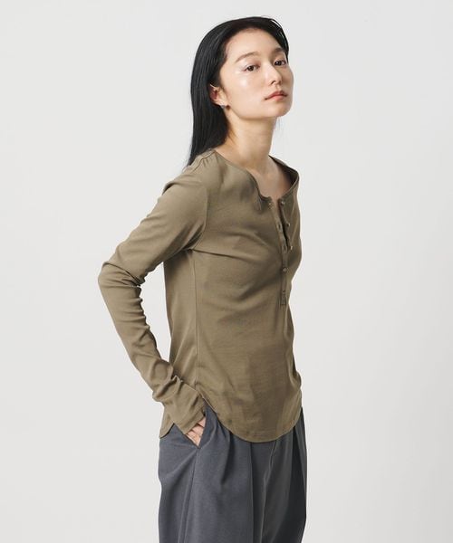 ミニマルなヘンリーネックが、落ち着いた印象を添えるロングスリーブカットソー。