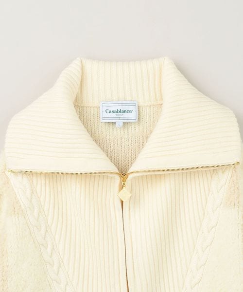 広めの襟と切り替え、ゴールドカラーのフルジップ仕様、引き手のロゴパーツがアクセントになっています。