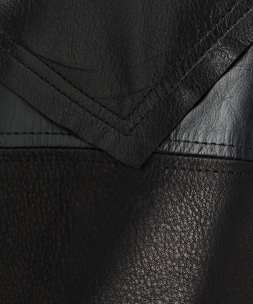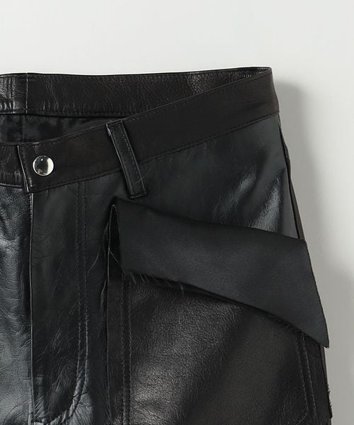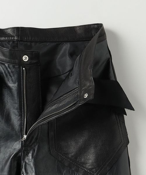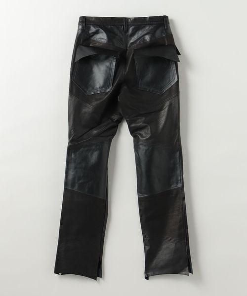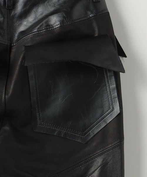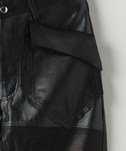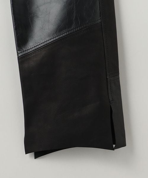 パーツごと表情のことなるレザーを組み合わせたモードな雰囲気のパンツ。