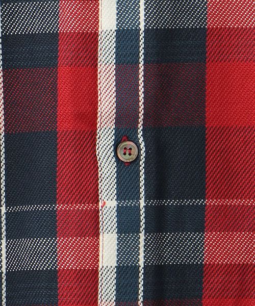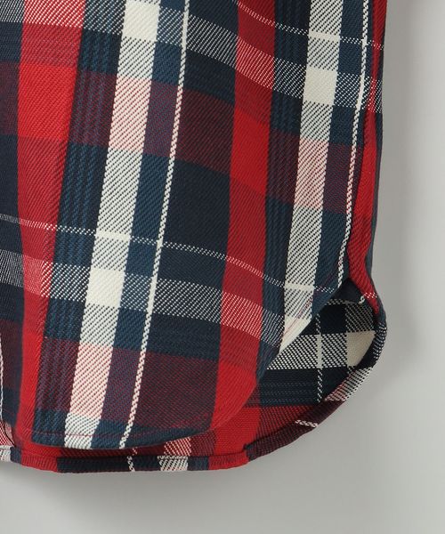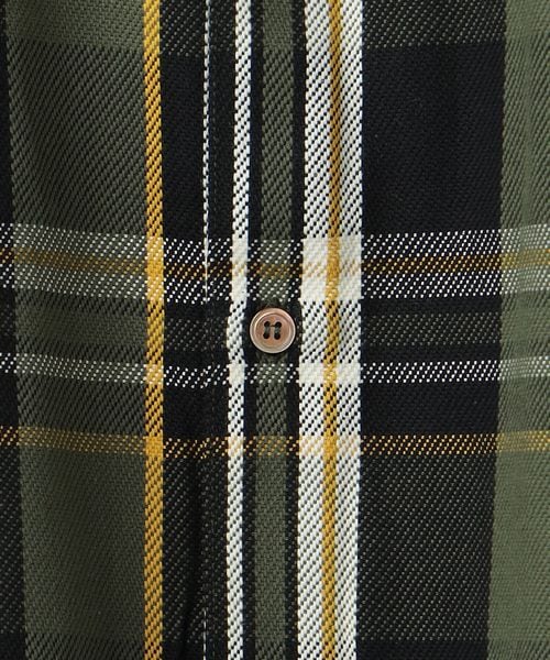 ボタンをずらしたアシンメトリーな襟が特徴のチェック柄のシャツ。