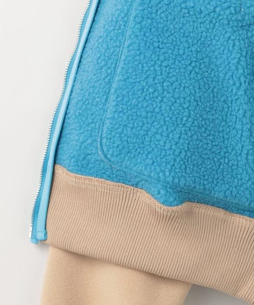 フロントのジッパーを閉めていても、パイピングやネックラインから明るいブルーの裏地がわかる、ニュートラルカラーの表地とのコントラストが際立つデザイン。