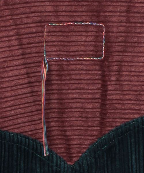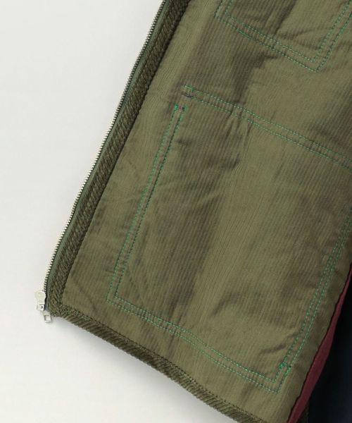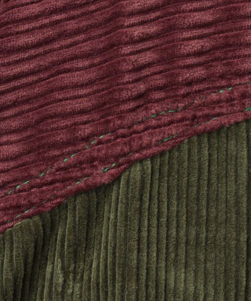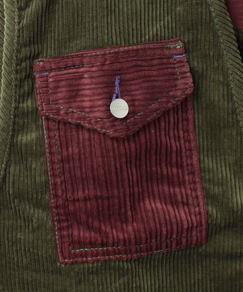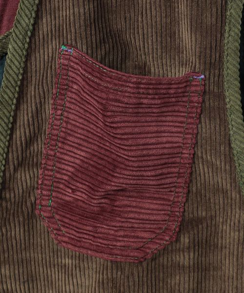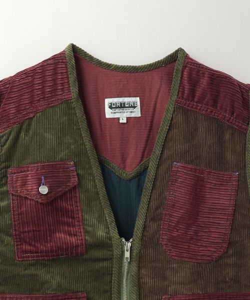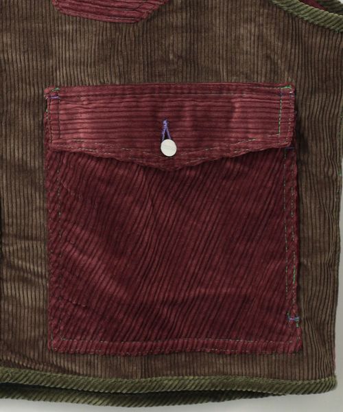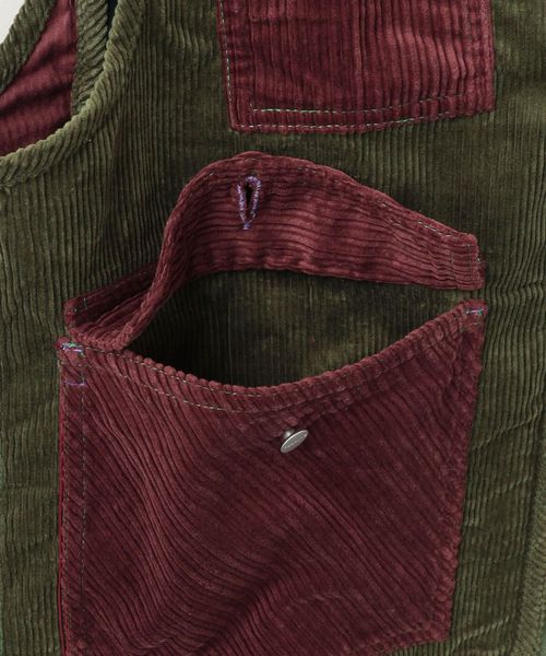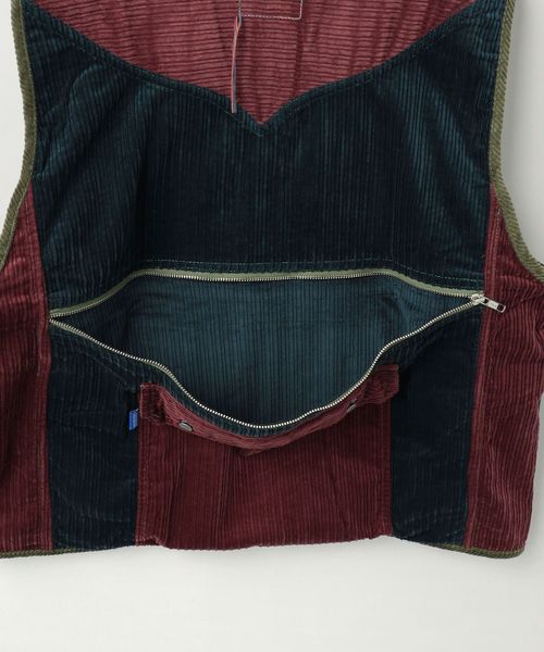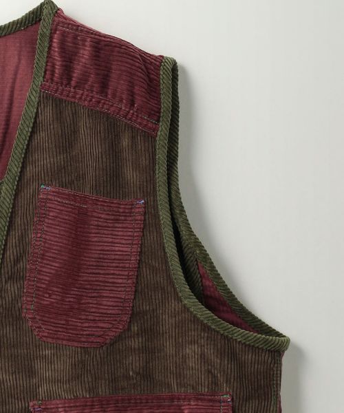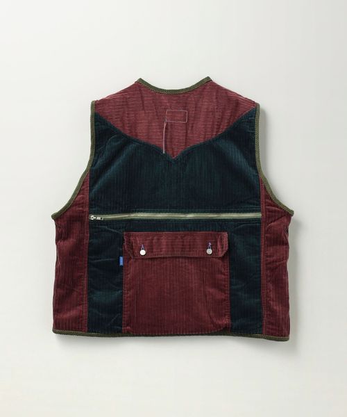 コーデュロイ素材を組み合わせた、カラーパネルデザインが目を引くベスト。