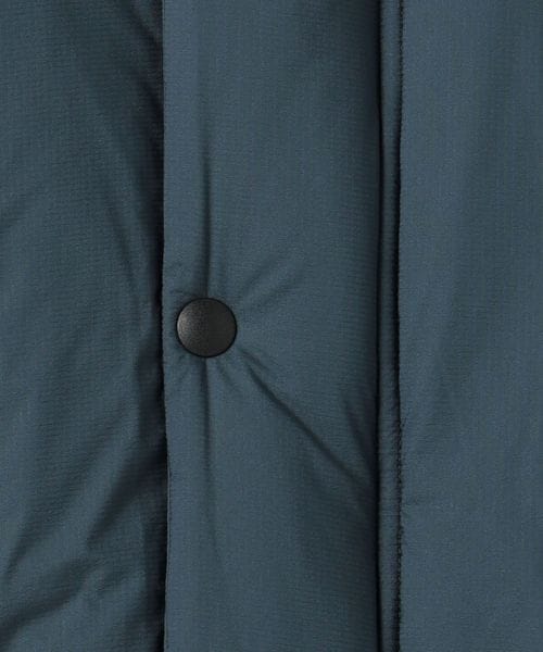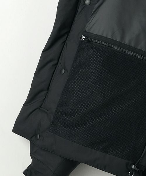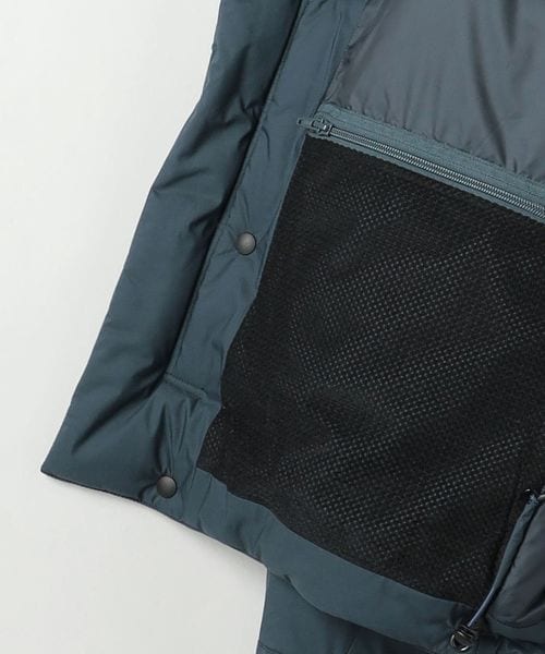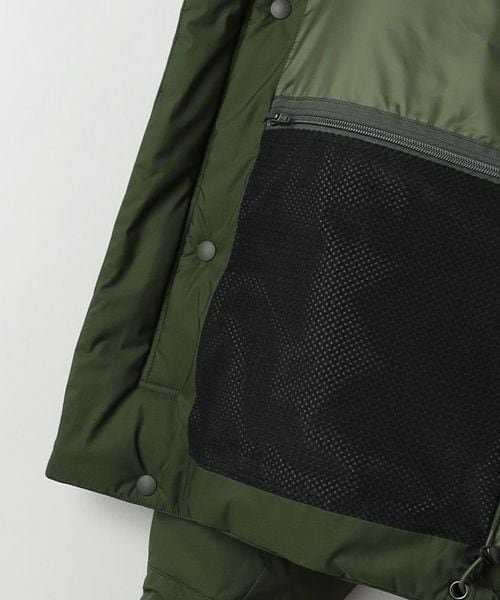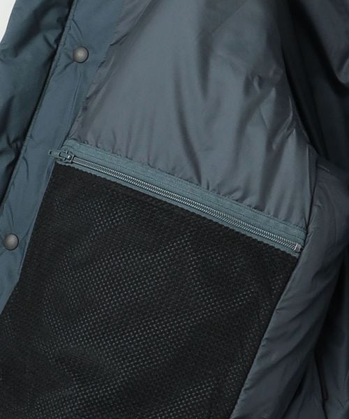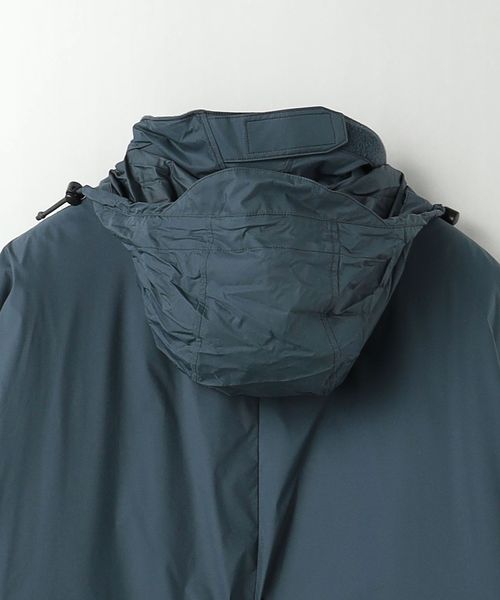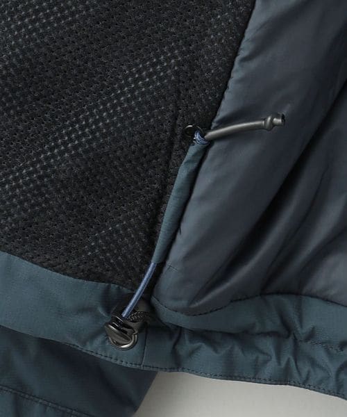 ネック内側にはフリース付き、後側・顔まわりにドローコードを配したつば付きフードは、襟元に収納することが可能。