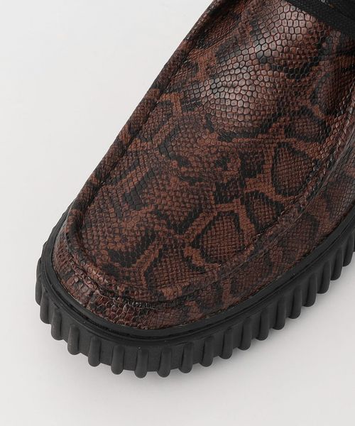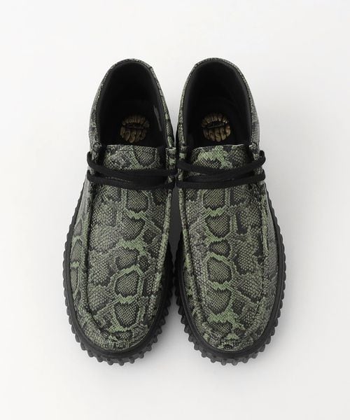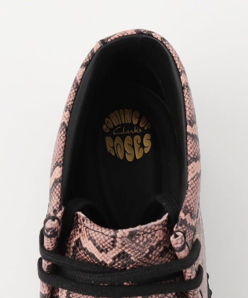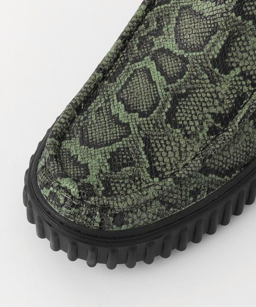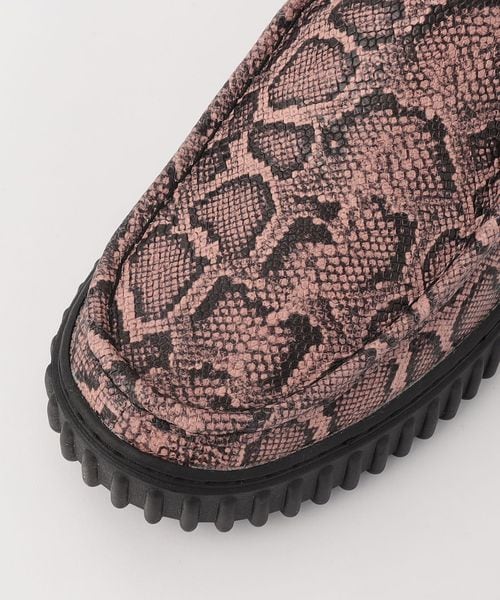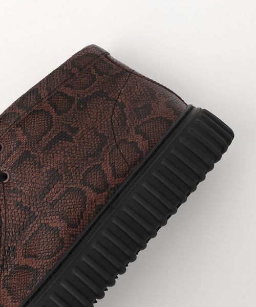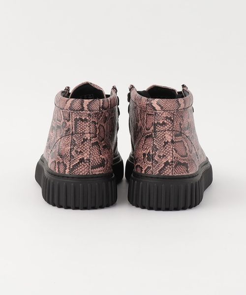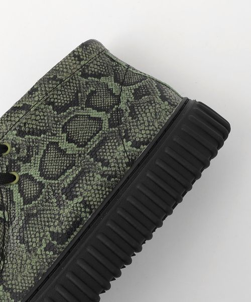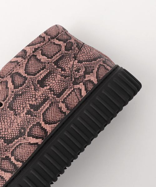 デボス加工を施したレザーのブランドフォブで仕上げたスタイルは、アッパーに大胆なピンク・ブラウン・グリーンのスネークエフェクトレザーを採用。