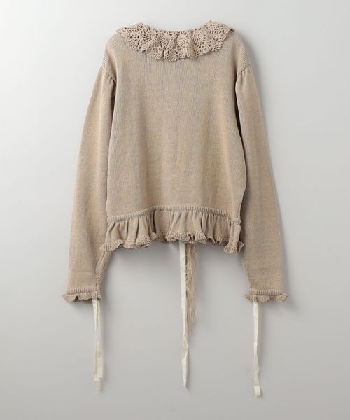 クロシェ編みやフリルが配されたエレガントなカーディガン。