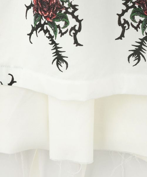 カットオフされた裏地のレイヤードや糸端をたらすなど個性溢れるデザイン。