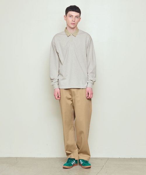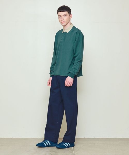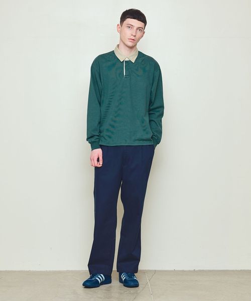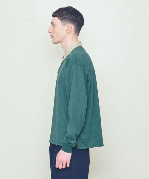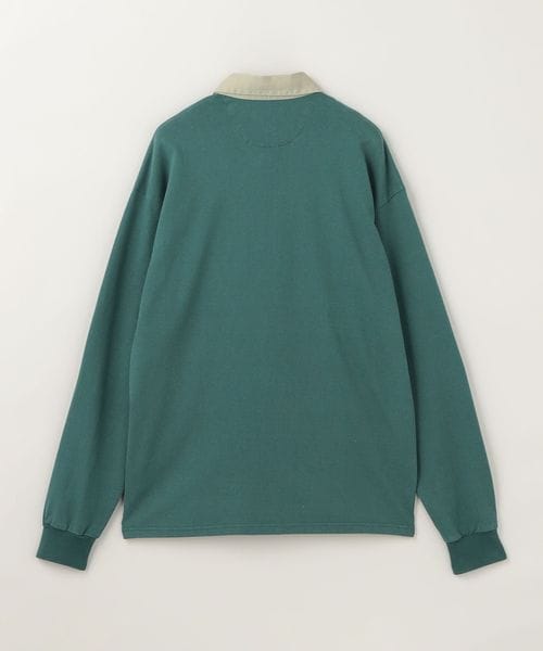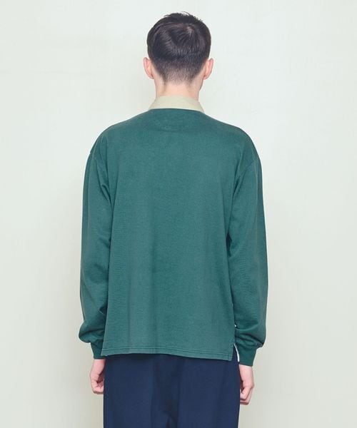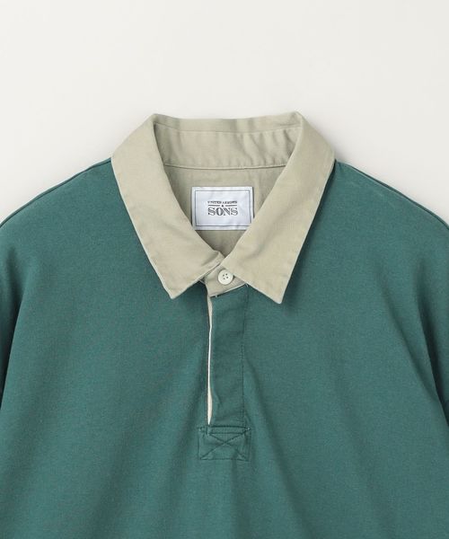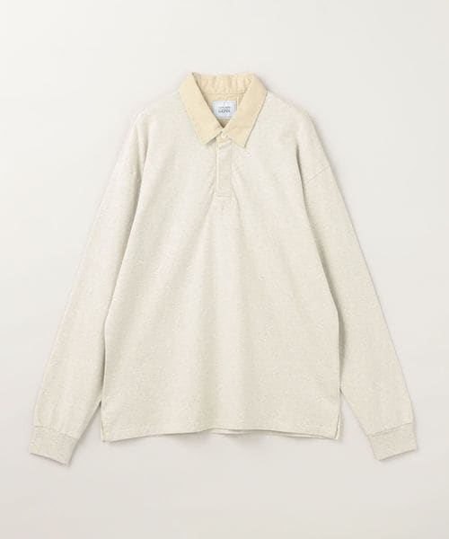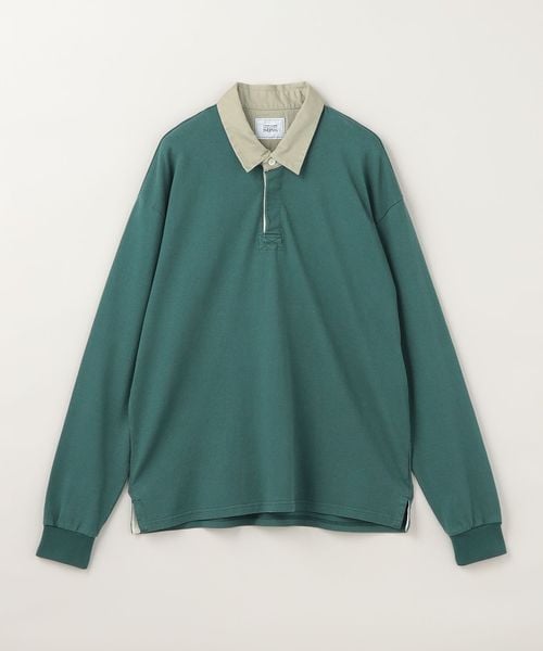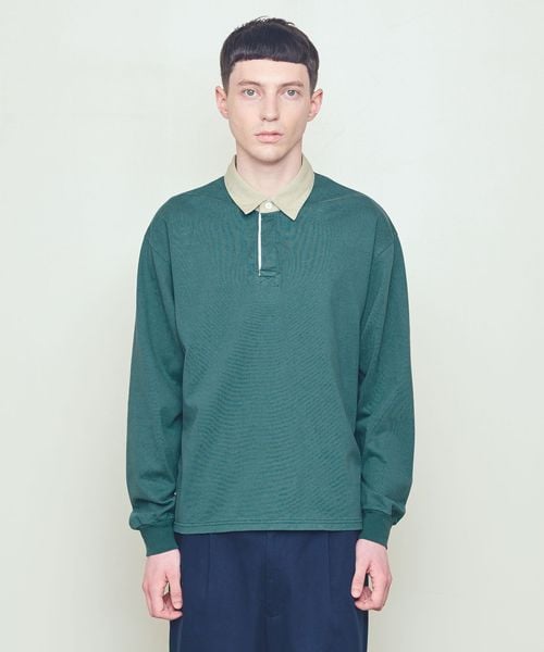 衿に別素材を用いた配色の組み合わせが特徴のラグビーシャツ。
