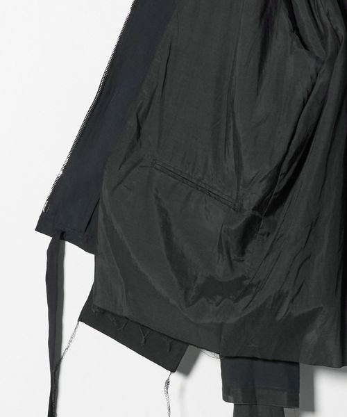 裾や袖に覗くカットオフされた裏地のレイヤードに、揺れるリボンや糸端が独自の存在感を放ちます。