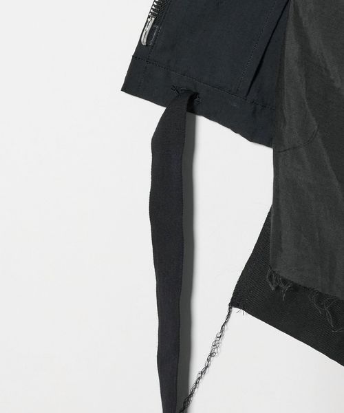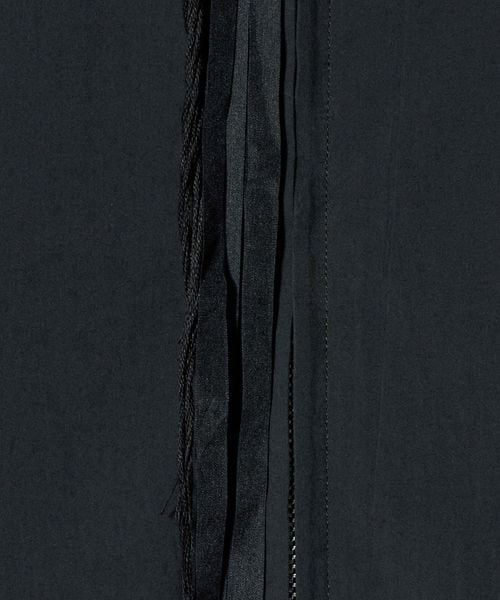緑川氏のアーティザナルな思考を反映したウェアには、リボンテープや袖や裾からはみ出る生地といったデコラティブなディテールが施されている。