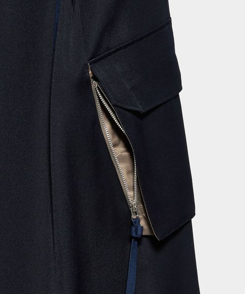 垂らされたリボンやメタリックカラーのファスナーがアクセントとなり、存在感のあるポケットディテールがモードな雰囲気を演出します。