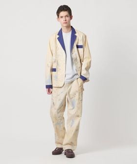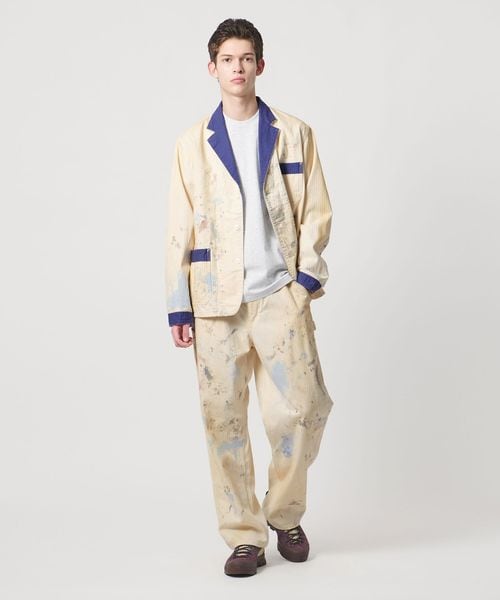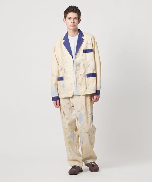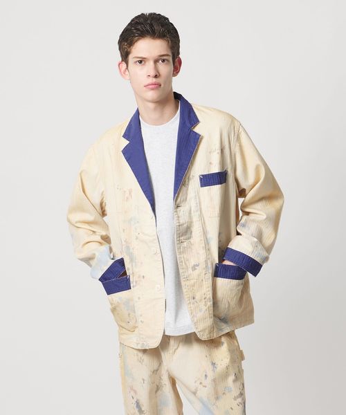 ヘリンボーン生地をツートーンで構成した本アイテムは映画の世界に登場する、マッドサイエンティスト(狂気の科学者)をイメージし、アーカイブにも見られた、液体を用いた科学実験の際に付着したような水性のシミや日焼けを職人の手作業によって忠実に再現。