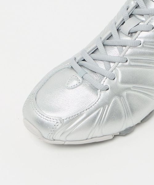光沢感のあるメタリックカラーを用いた大胆なデザインがコーディネートにアクセントを添えます。