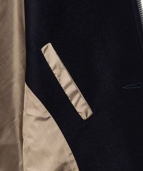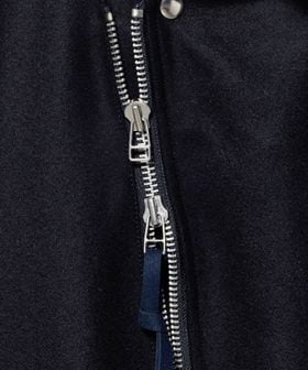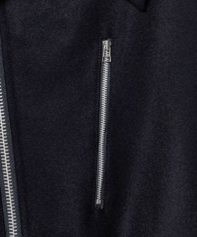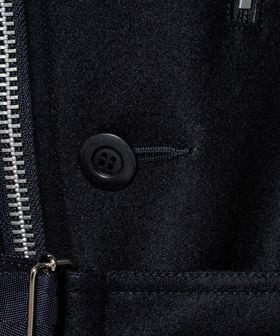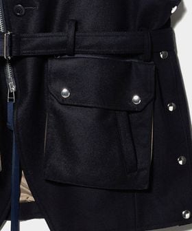 メタリックカラーのファスナーやボタンがアクセントとなり、存在感のあるポケットディテールがモードな印象を演出します。